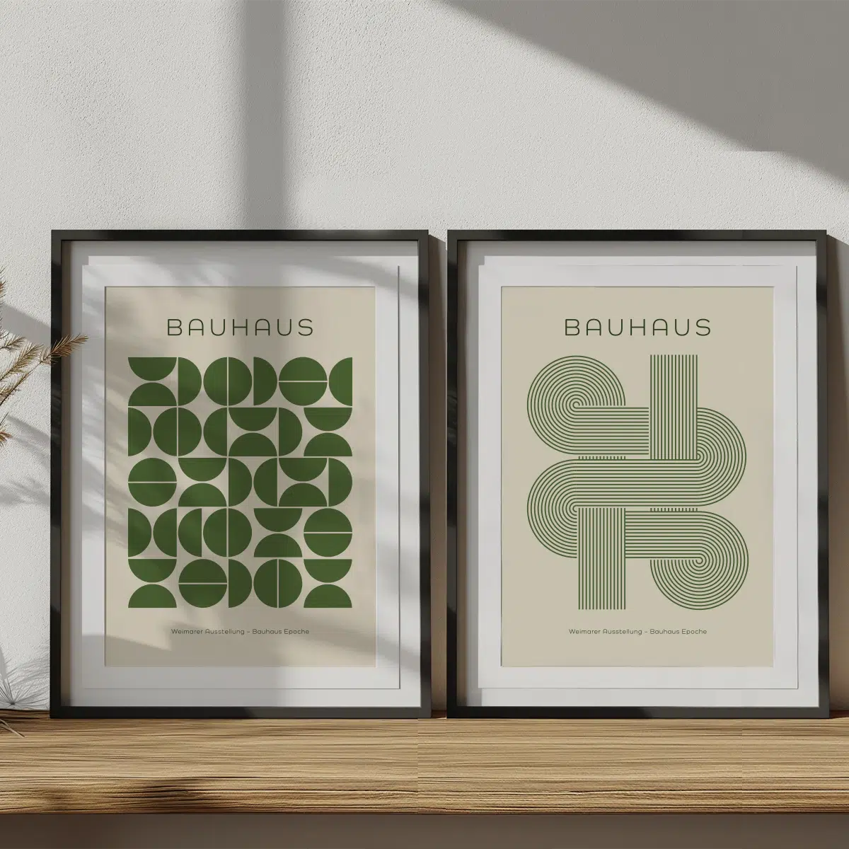 Das Poster „Bauhaus Geometry“ vereint moderne Kunst, klare Formen und natürliche Eleganz. In sattem Dunkelgrün auf einem warmen, cremefarbenen Hintergrund entsteht ein ausdrucksstarkes Zusammenspiel aus Struktur und Ruhe. Die geometrischen Halbkreise und Linien spiegeln den typischen Bauhaus-Stil wider, während die Farbgebung dem Motiv eine erdige, harmonische Tiefe verleiht.