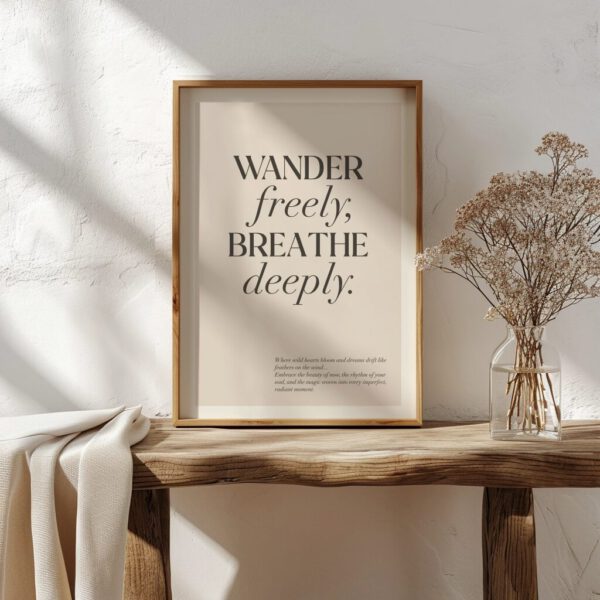 „Wander Freely, Breathe Deeply“ ist mehr als nur ein Poster – es ist ein Lebensgefühl. Die klare Typografie auf sanftem Beigeton erinnert dich jeden Tag daran, dir selbst Raum zu geben, durchzuatmen und deinen eigenen Weg zu gehen.