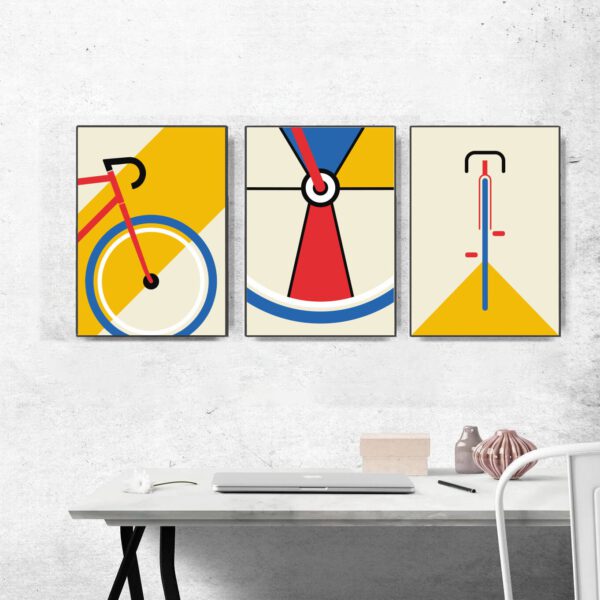 Ideal für Wohnzimmer, Büro oder kreative Arbeitsräume – dieses Triptychon bringt Klarheit und Stil an die Wand und ist ein originelles Geschenk für Radfahrerinnen und Radfahrer mit Sinn für Design.
