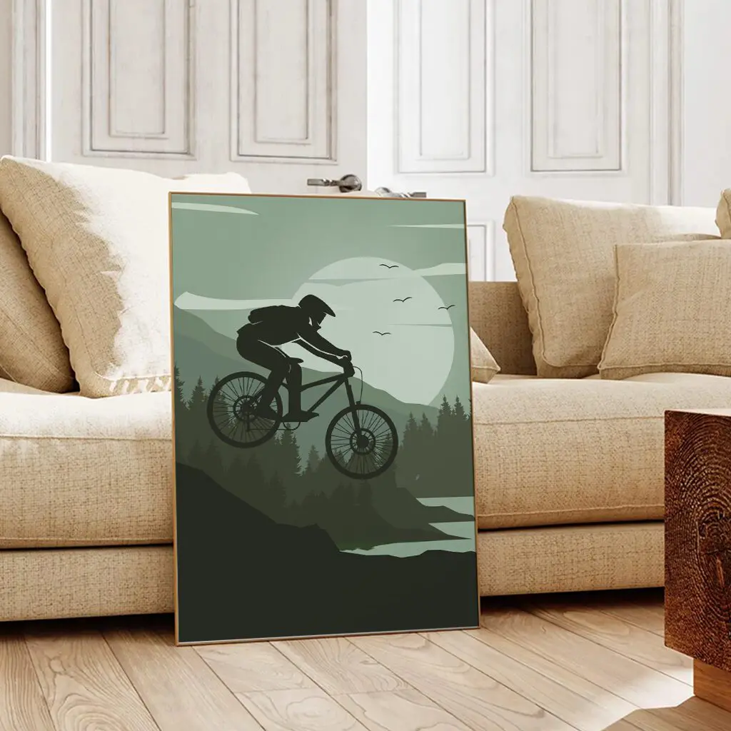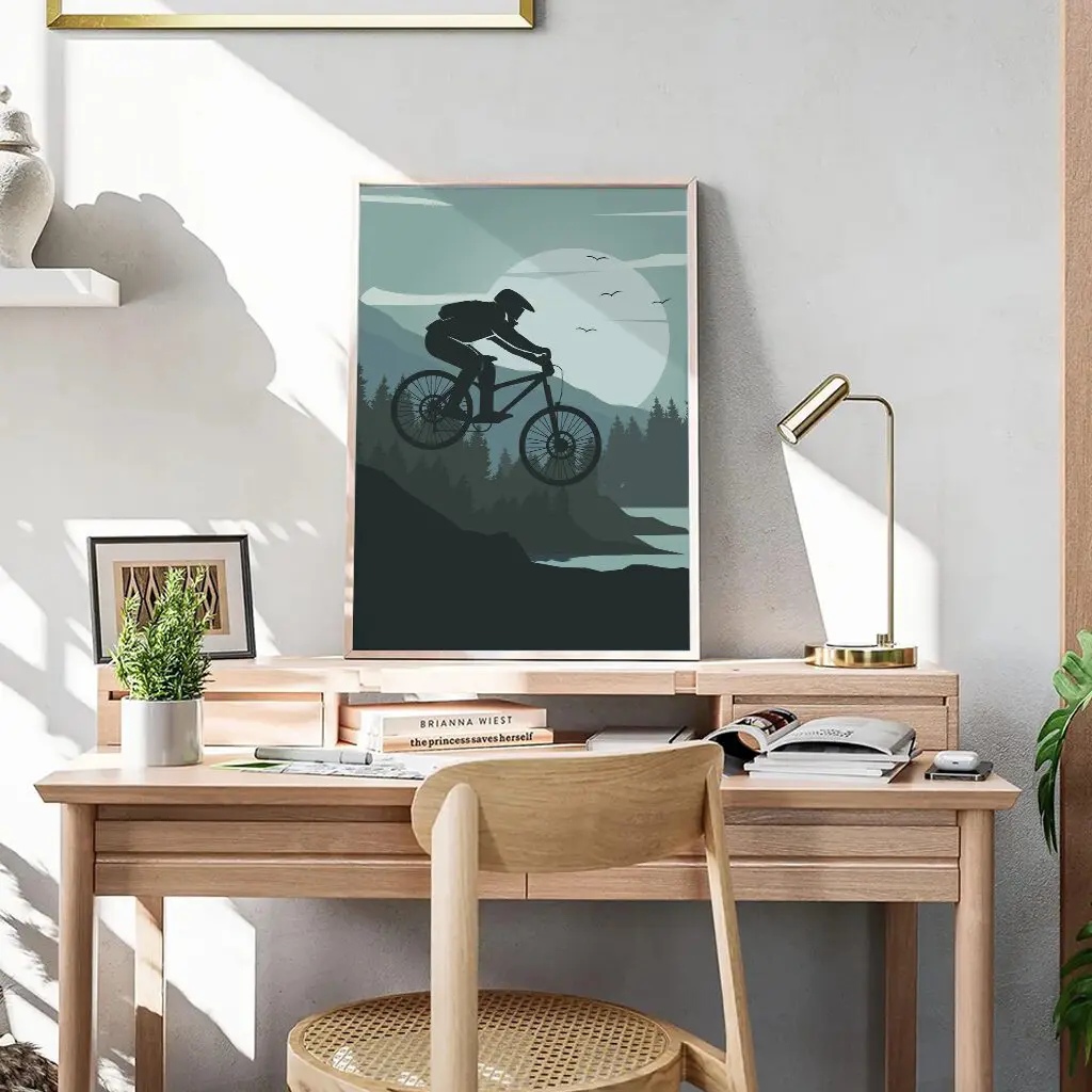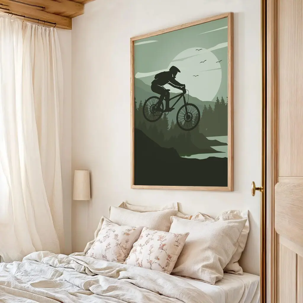 Die harmonischen Farben und klaren Silhouetten erzeugen Tiefe und Ruhe, während das Motiv Dynamik und Freiheit ausstrahlt. Ein eindrucksvolles Fahrrad Wandbild für alle, die Bewegung, Natur und Design lieben.