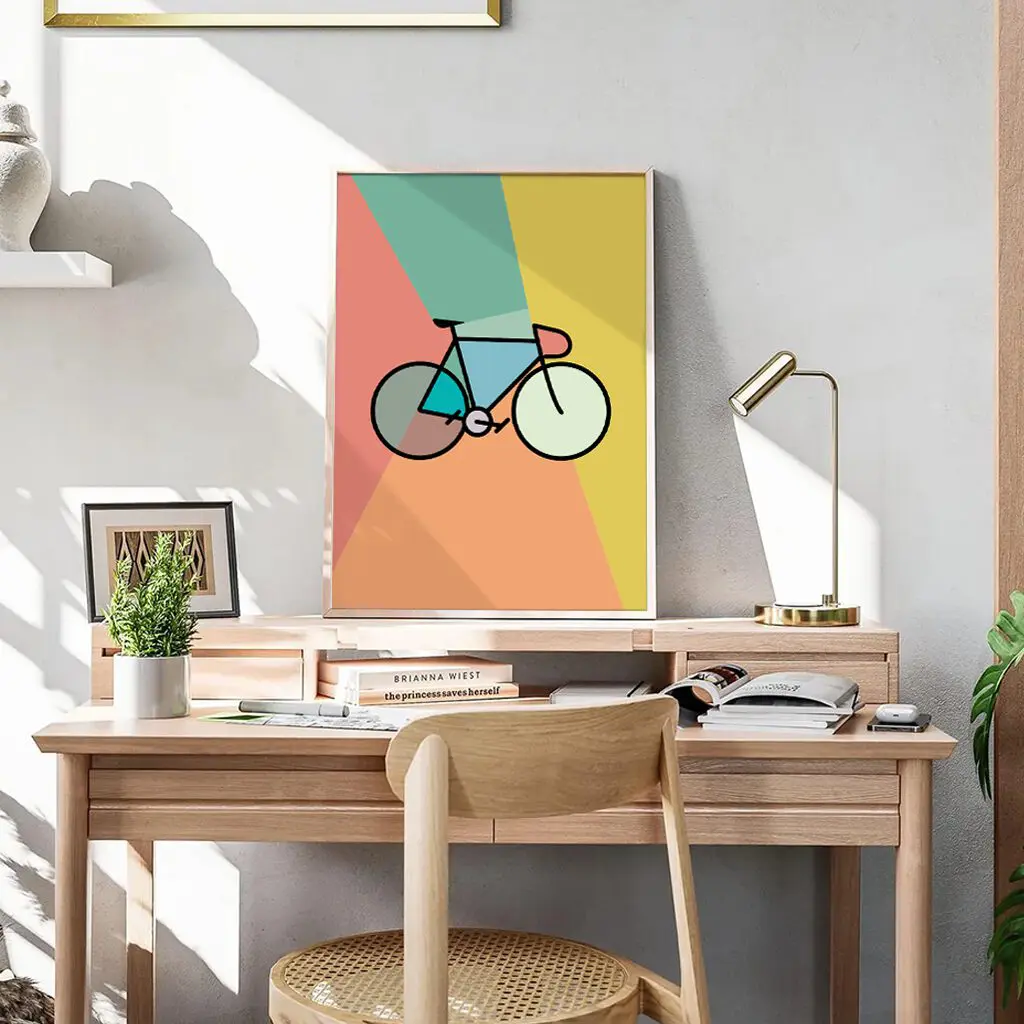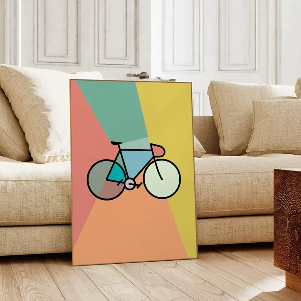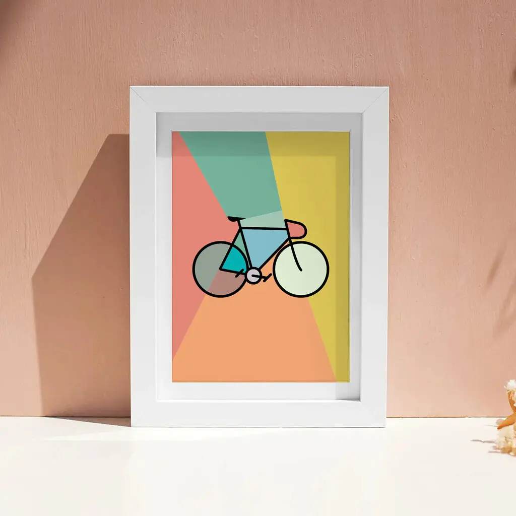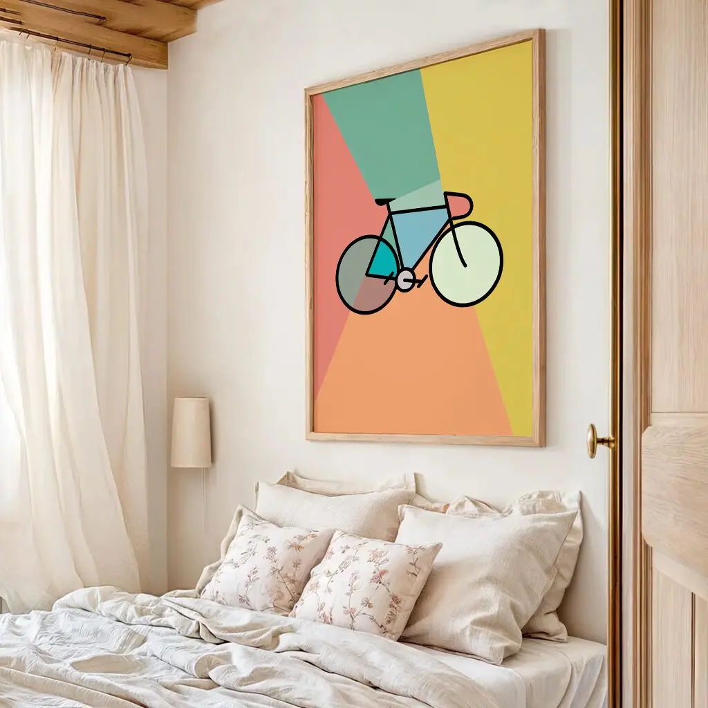 Das Poster „Geometry Ride“ vereint die Liebe zum Fahrrad mit zeitgemäßem Grafikdesign. In einer klaren, geometrischen Formsprache dargestellt, steht das Fahrrad im Mittelpunkt eines harmonischen Farbkonzepts aus warmen und frischen Tönen. Die reduzierte Linienführung verleiht dem Motiv eine ruhige Eleganz, während die Farbflächen Dynamik und Leichtigkeit transportieren.