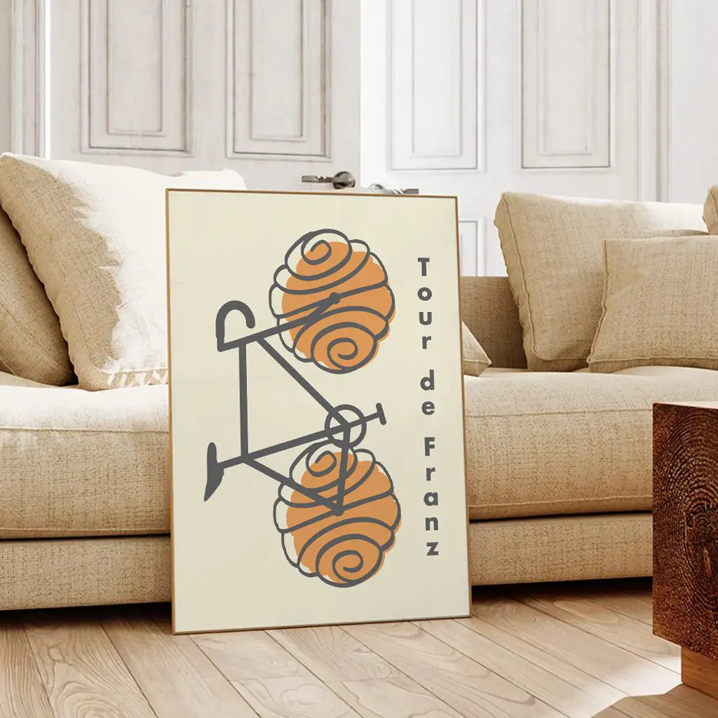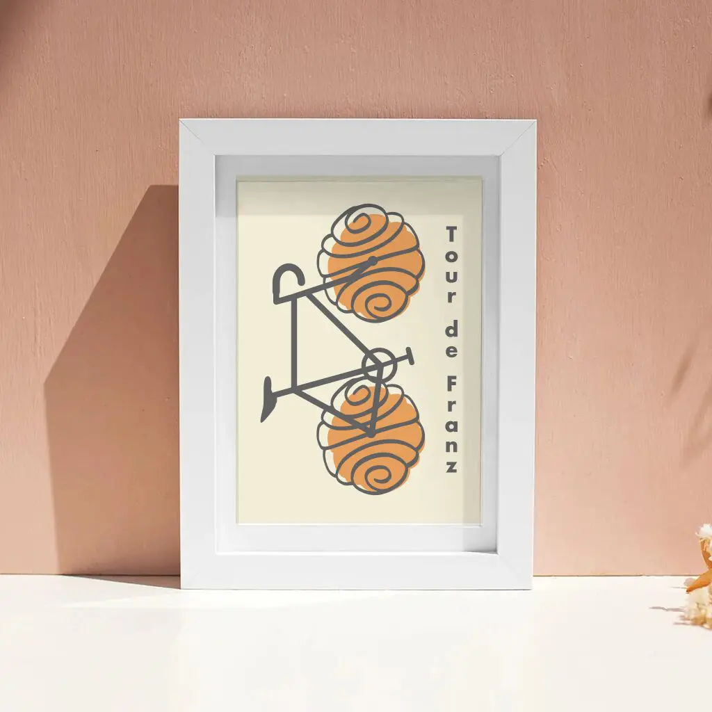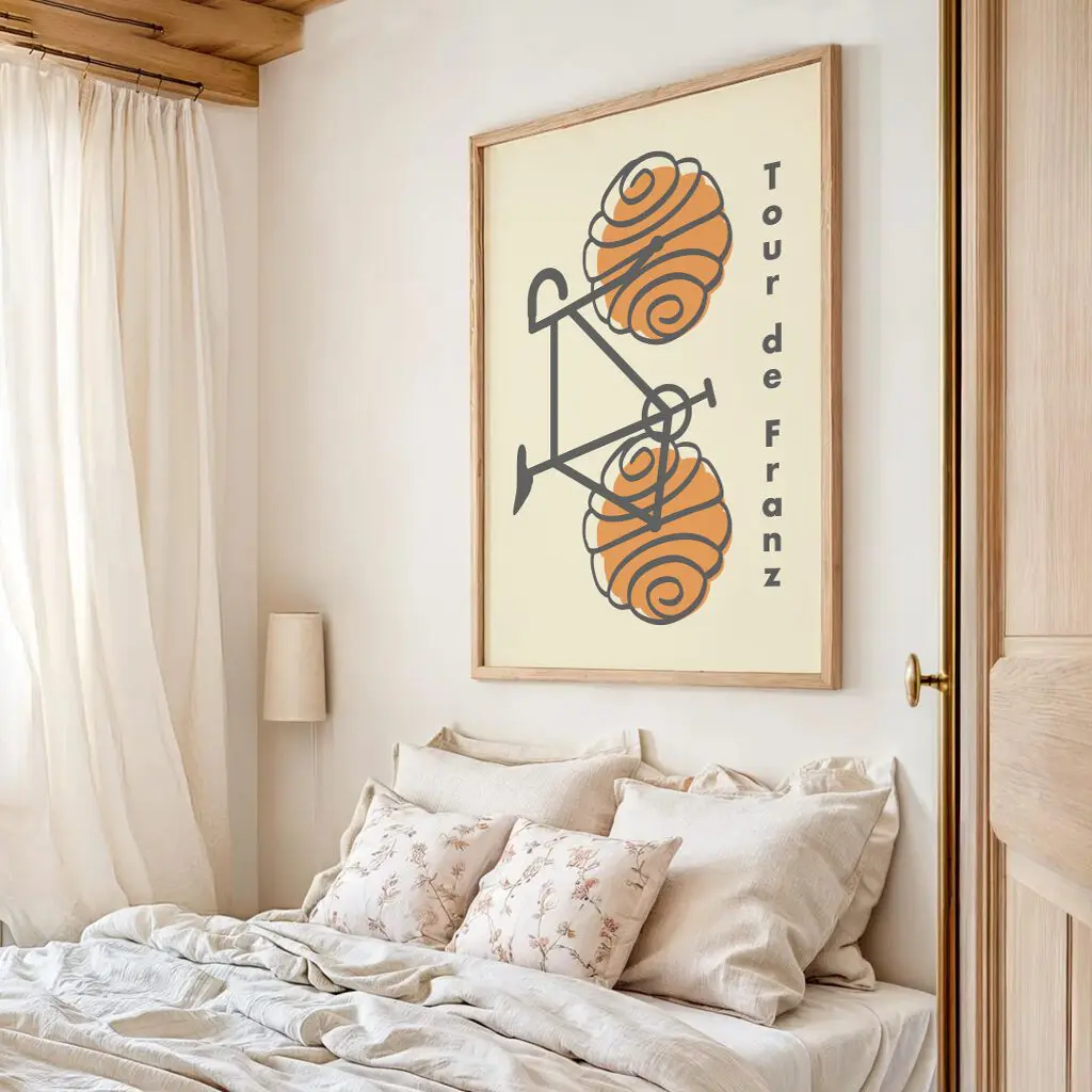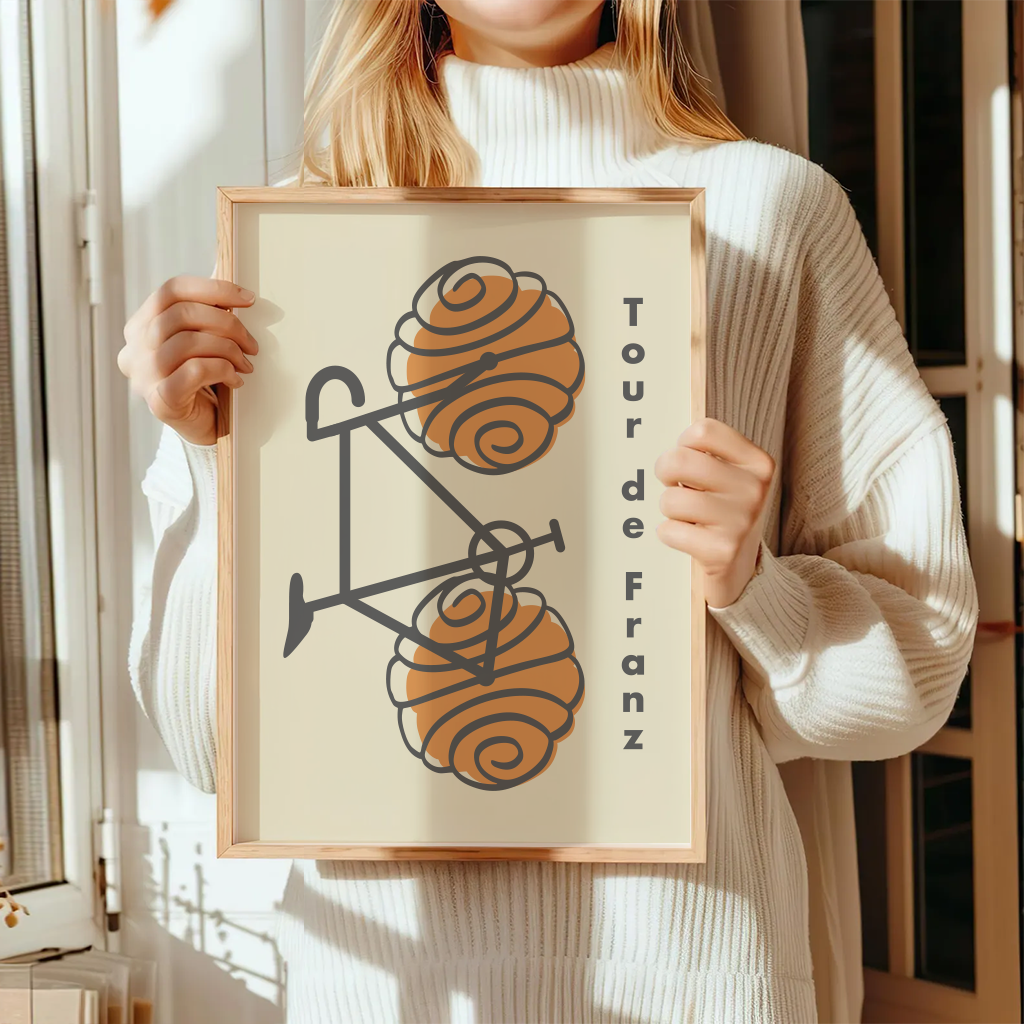 Doppeltes Franzbrötchen, doppelter Fahrspaß! Das „Tour de Franz – Double Wheel Edition“ setzt das Fahrrad auf zwei „buttrige“ Räder und kombiniert humorvolle Illustration mit modernem Grafikdesign. Ideal für Küche, Wohnzimmer oder Fahrradkeller – überall dort, wo gute Laune willkommen ist.
