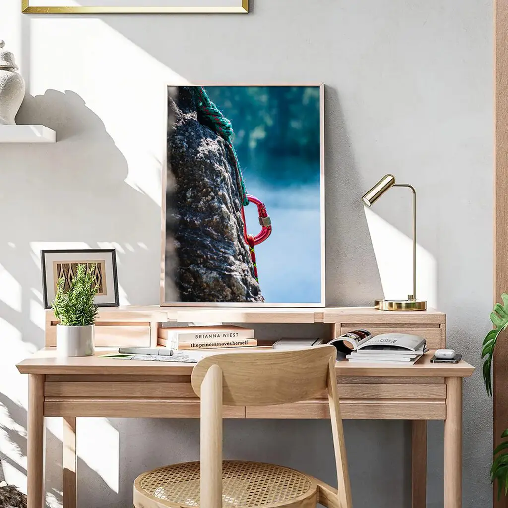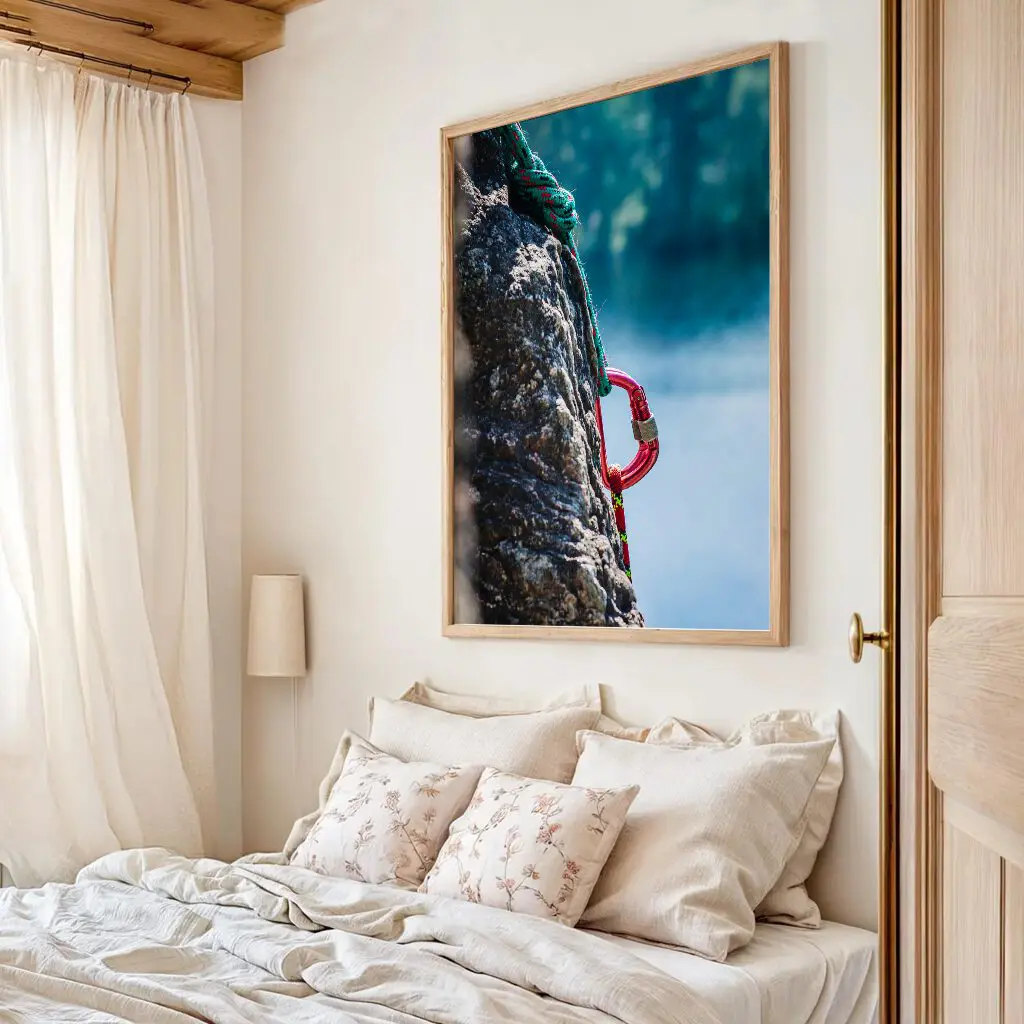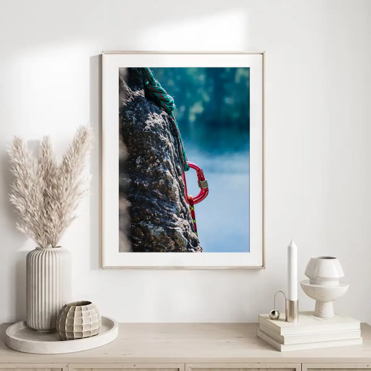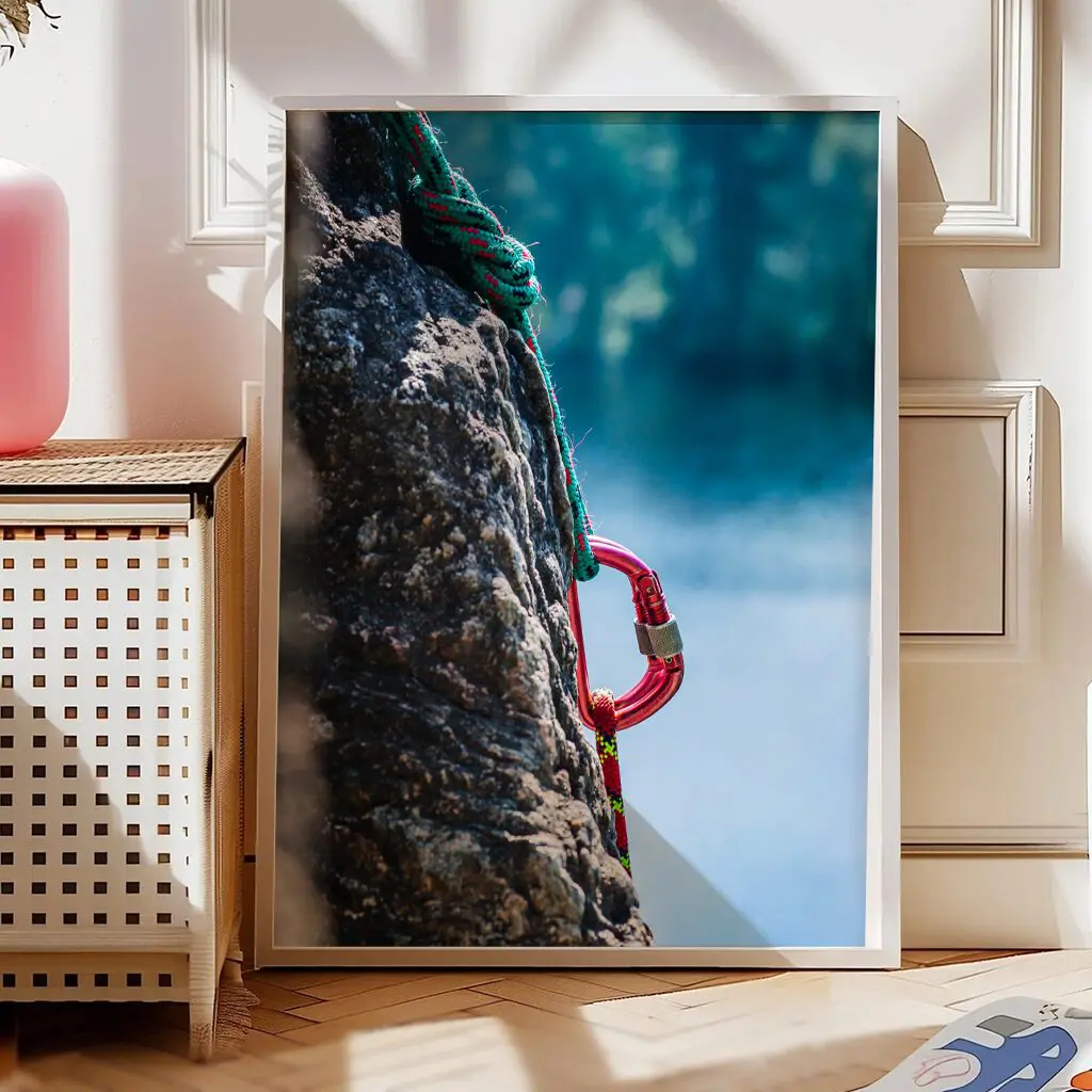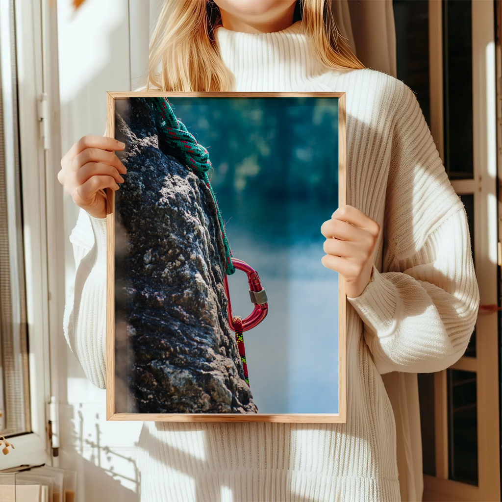 Dieses Klettermotiv rückt ein oft übersehenes Detail in den Fokus: Vertrauen in Material und Technik. Der Karabiner am Fels steht sinnbildlich für Sicherheit, Präzision und Verantwortung beim Klettern. Die ruhige Tiefenwirkung und natürlichen Farben machen das Poster zu einem starken, sachlichen Akzent für moderne Räume.