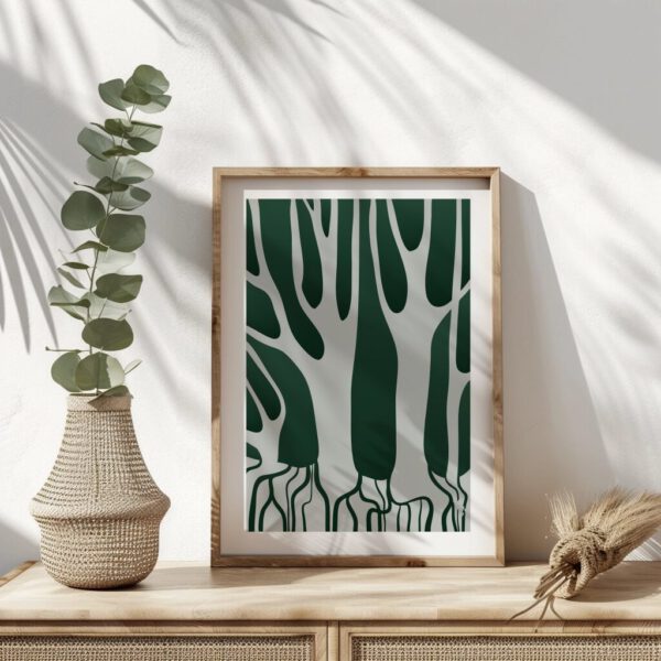 Dieses Wandbild fängt die geheimnisvolle Tiefe des Waldes in einer minimalistischen Illustration ein. Der Fokus liegt auf zwei imposanten Bäumen, deren Wurzeln mit präziser Eleganz unter der Erde dargestellt sind. Ihre Äste, die sich ruhig gen Himmel erstrecken, und die weit verzweigten Wurzeln, die den Boden durchziehen, symbolisieren die untrennbare Verbindung zwischen ober- und unterirdischem Leben. Diese subtile Darstellung ruft eine Atmosphäre der Ruhe und des Einklangs mit der Natur hervor, die sich perfekt in jedes Zuhause einfügt.