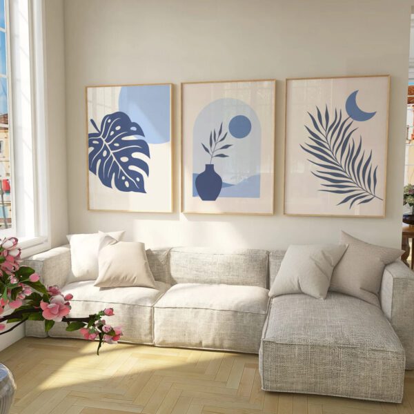 Hol dir die ruhige Eleganz der Natur in dein Zuhause mit unserem 3-teiligen botanischen Wandbild „Nature in Motion“. Dieses stilvolle Kunstwerk zeigt organische Formen, Blätter und natürliche Elemente in sanften Blautönen – inspiriert vom Boho-Stil und moderner Wohnkultur.