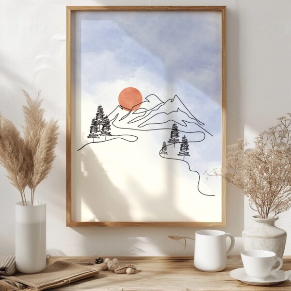 Die weichen Farben und die minimalistische Gestaltung verleihen dem Poster eine elegante Note, die sich nahtlos in moderne Einrichtungen integriert. In diesem Artwork scheint die Sonne hinter einem Berg hervor. Dieses Kunstwerk ist nicht nur dekorativ, sondern auch eine Hommage an die Schönheit der Natur.