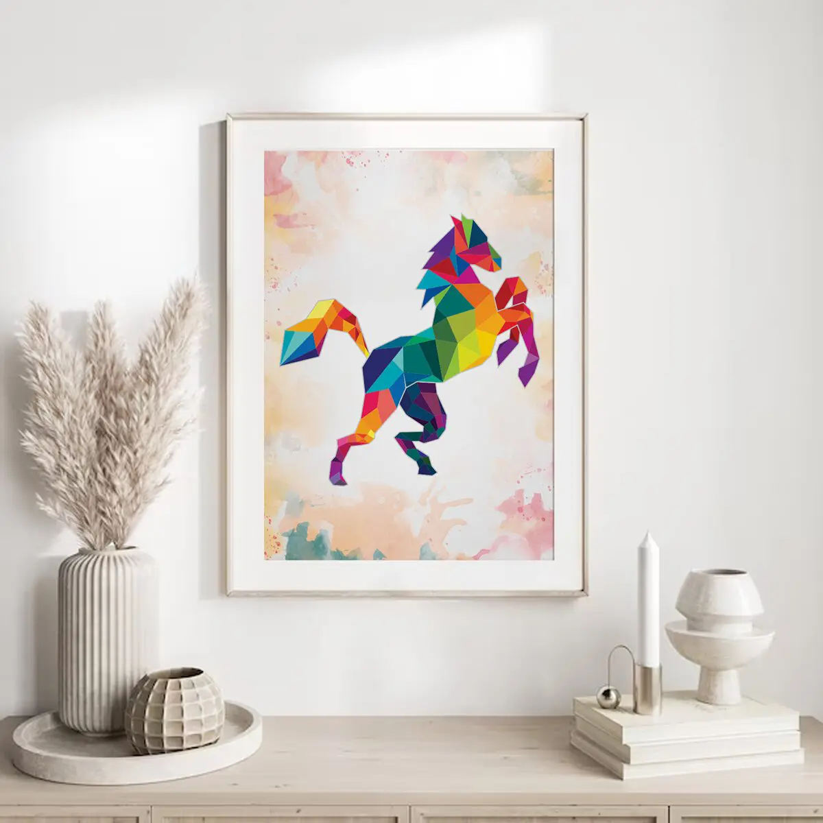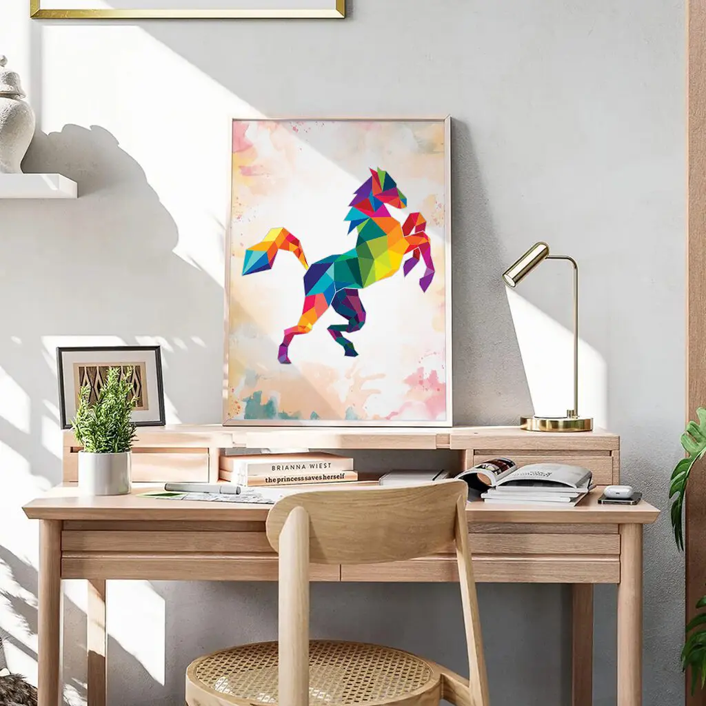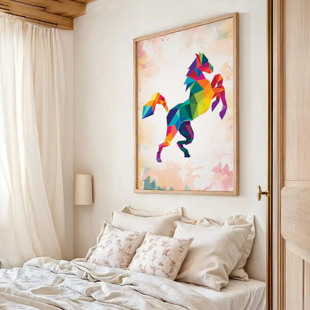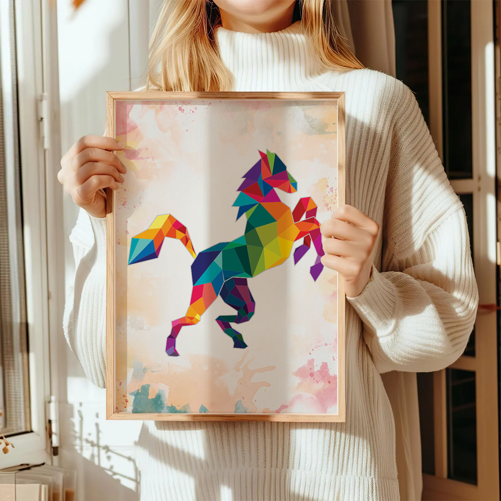 Dieses ausdrucksstarke Pferdemotiv verbindet kraftvolle Bewegung mit einem modernen, geometrischen Design. Die leuchtenden Farben und klaren Formen verleihen dem Motiv Energie, Freiheit und Lebensfreude. Ein besonderes Poster für alle, die Pferde als Symbol für Stärke, Eleganz und Individualität lieben.