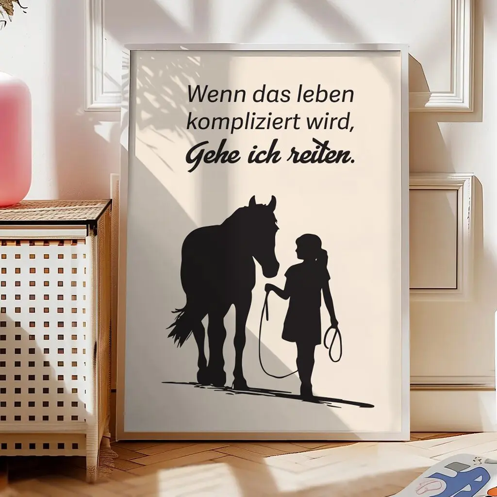 Manchmal braucht es keine langen Erklärungen – nur ein Pferd und einen ruhigen Moment. Dieses stilvolle Pferde Poster zeigt die Silhouette eines Mädchens mit ihrem Pferd, begleitet vom emotionalen Spruch: