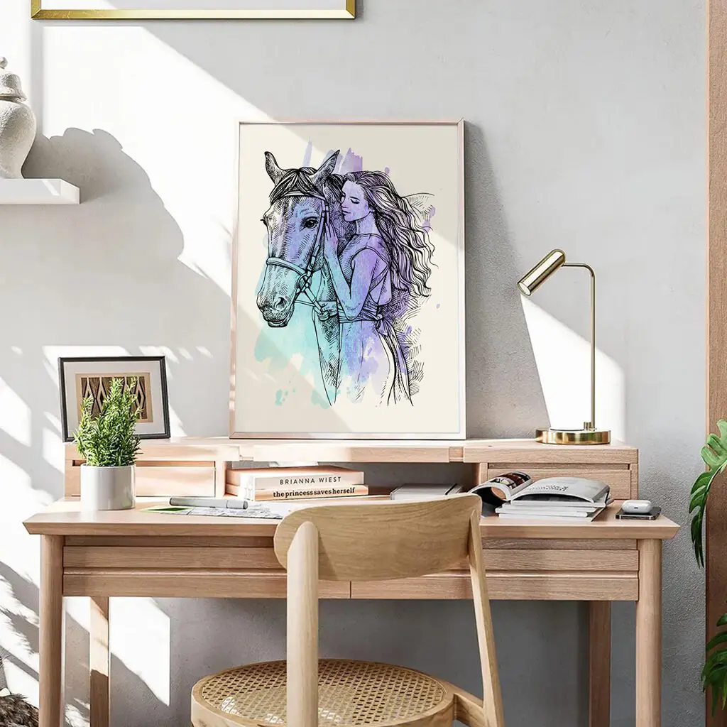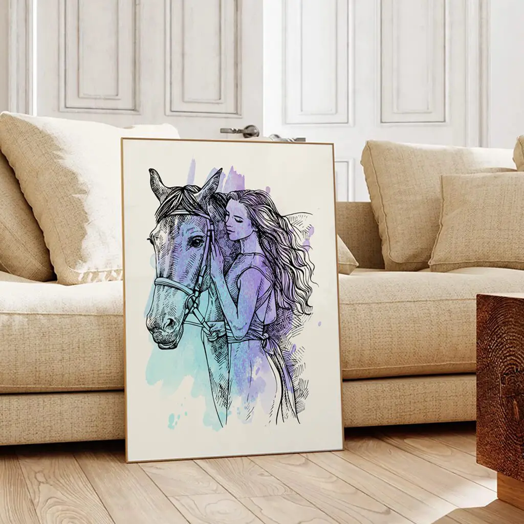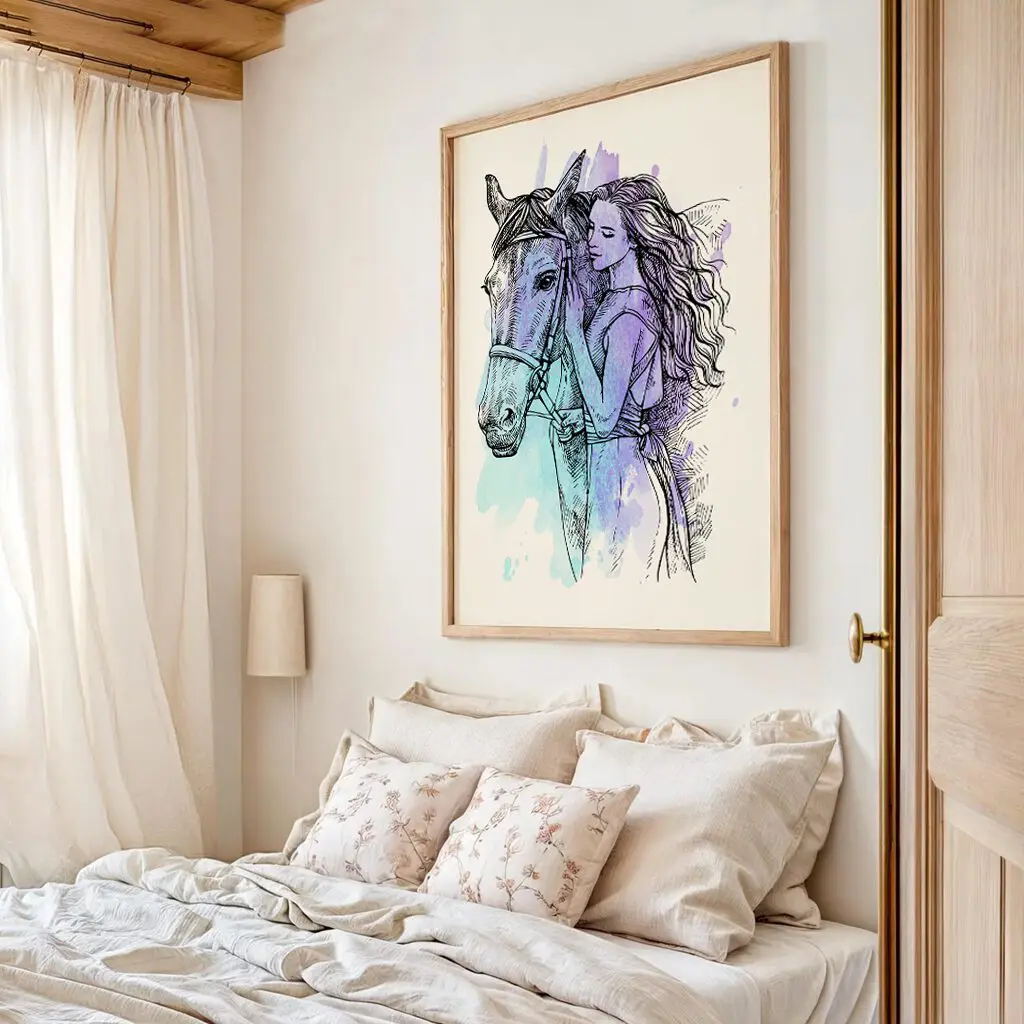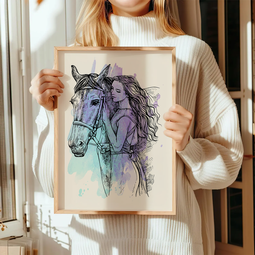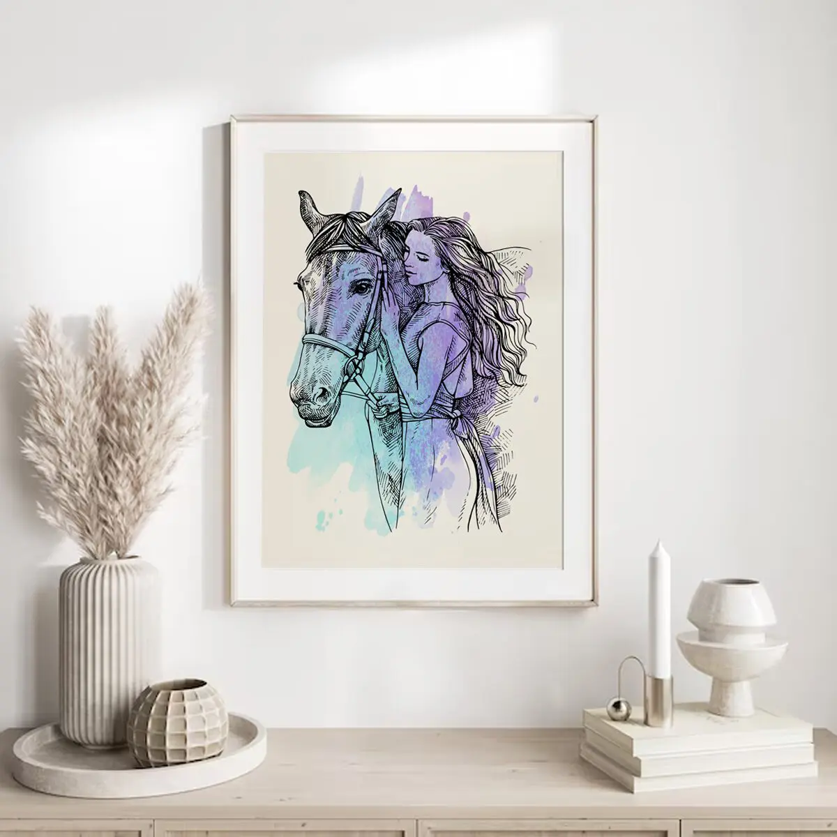 Dieses gefühlvolle Pferdemotiv zeigt einen innigen Moment zwischen Frau und Pferd – leise, vertraut und voller Nähe. Die feinen Linien der Illustration verbinden sich mit sanften Aquarellakzenten in Violett- und Grüntönen und unterstreichen die emotionale Tiefe der Szene. Whispered Bond steht für Vertrauen, Verbundenheit und die stille Sprache zwischen Mensch und Pferd. Ein ausdrucksstarkes Kunstwerk für Pferdeliebhaber, das Ruhe, Wärme und Eleganz ausstrahlt.