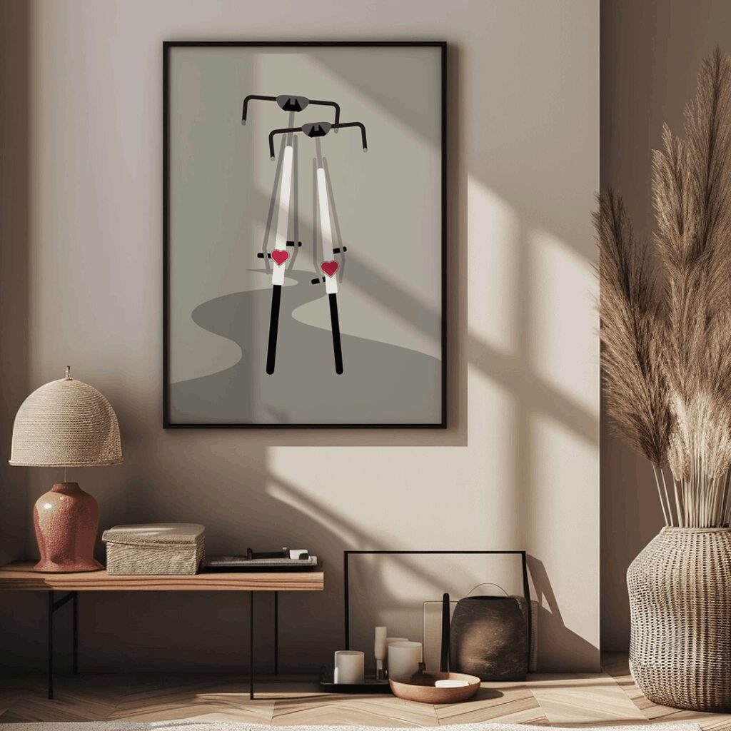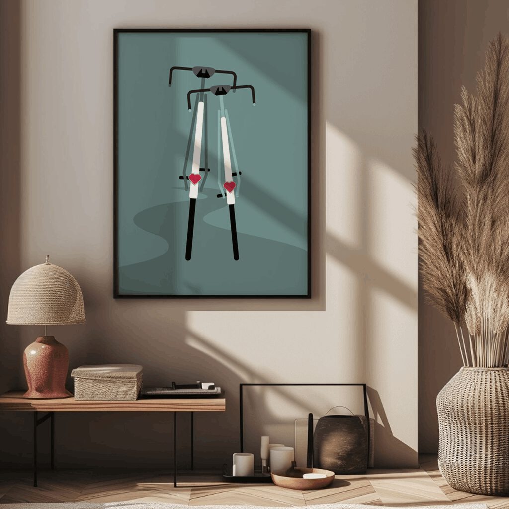 Die sanften Farben und die harmonische Komposition verleihen dem Poster eine zeitlose Ästhetik, die in jedem Raum eine besondere Atmosphäre schafft. Ob im Wohnzimmer, Büro oder Fahrradwerkstatt – dieses Poster ist ein Blickfang, der die Begeisterung für das Radfahren in jeder Umgebung hervorhebt.