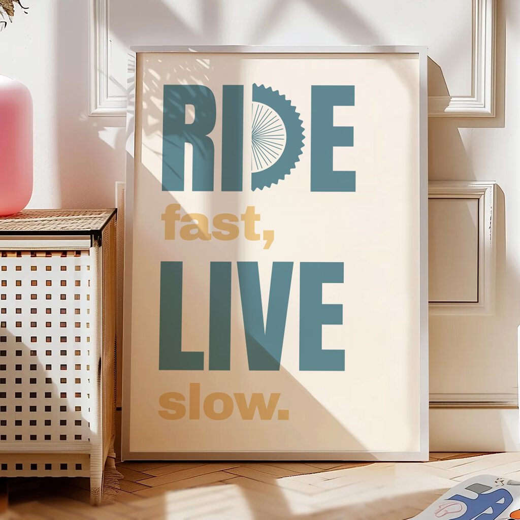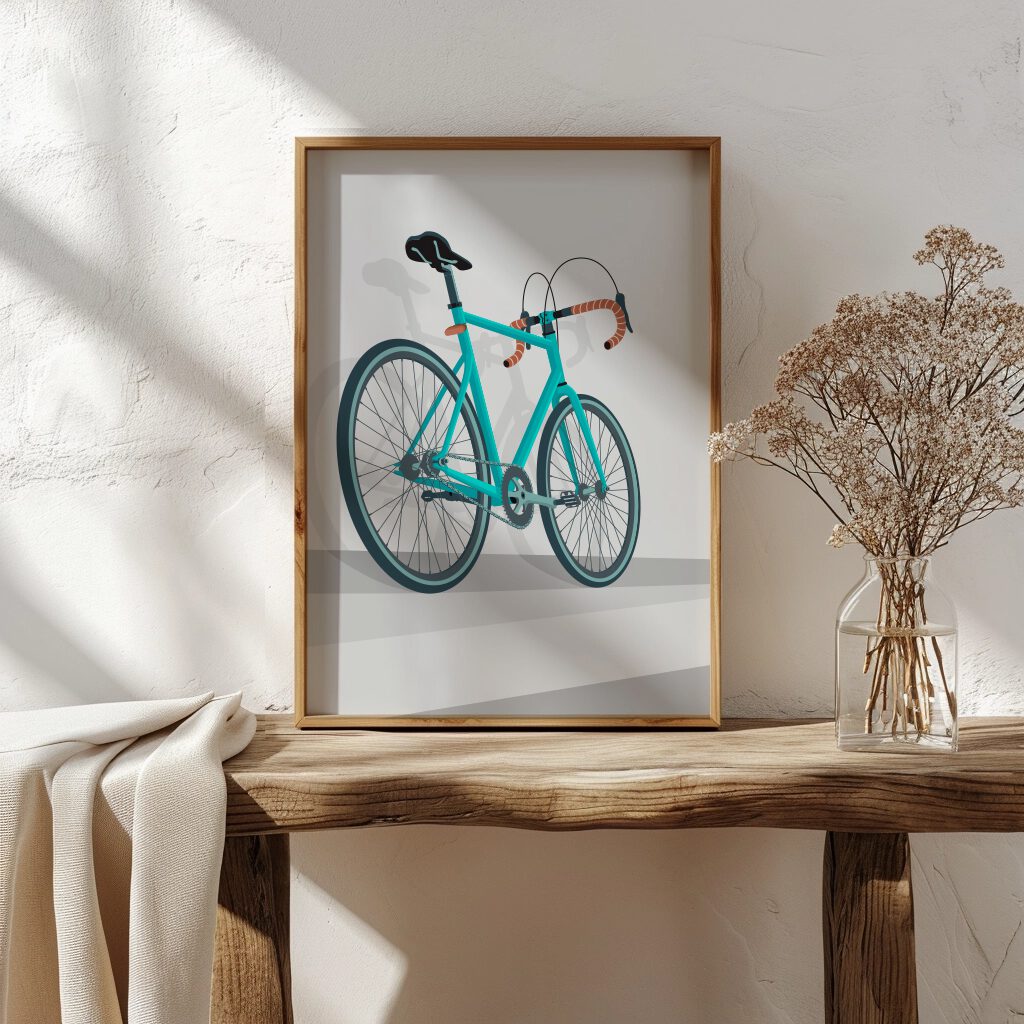 Die sanften Farben und die harmonische Komposition verleihen dem Poster eine zeitlose Ästhetik, die in jedem Raum eine besondere Atmosphäre schafft. Ob im Wohnzimmer, Büro oder Fahrradwerkstatt – dieses Poster ist ein Blickfang, der die Begeisterung für das Radfahren in jeder Umgebung hervorhebt.