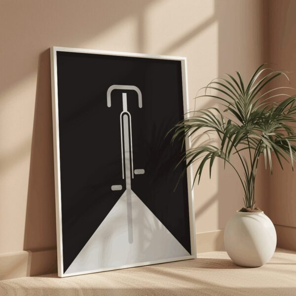 Das Wandbild “Just Ride” präsentiert ein Fahrrad in frontaler Ansicht, wobei die simplen Elemente eine zeitlose Ästhetik schaffen. Die klaren Konturen und die dezente Farbpalette verleihen dem Bild eine schlichte Eleganz, die sich mühelos in verschiedenste Einrichtungsstile integriert.