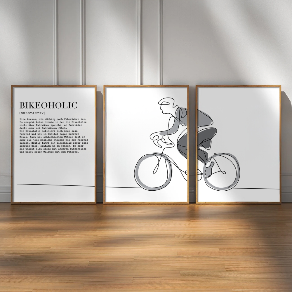 Verleihe deinem Raum mit diesem beeindruckenden 3-teiligen Fahrrad-Illustration Poster im OneLine-Stil eine fröhliche Note und zeige stolz deine Zugehörigkeit zur Bikeoholic-Community.