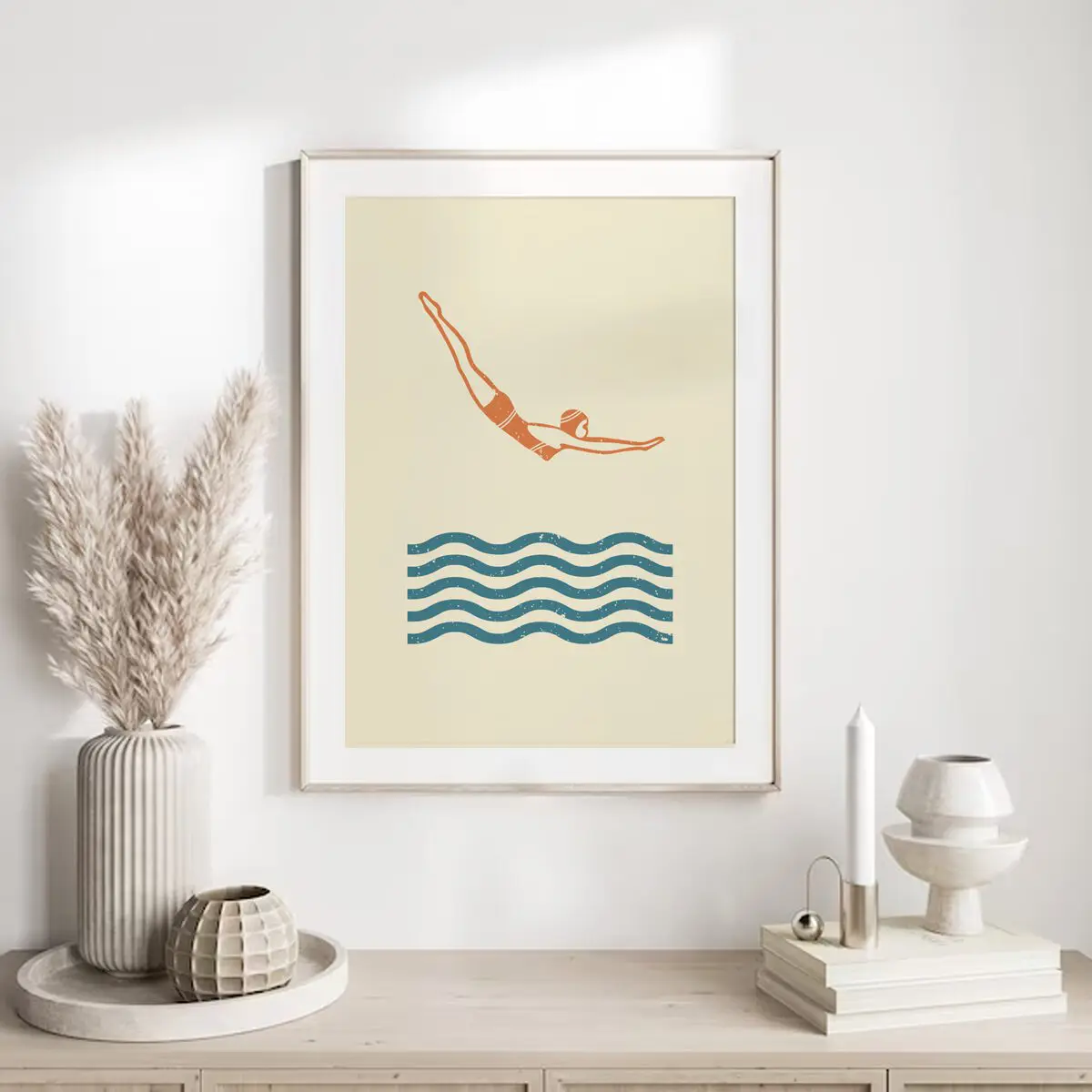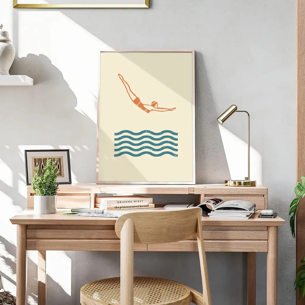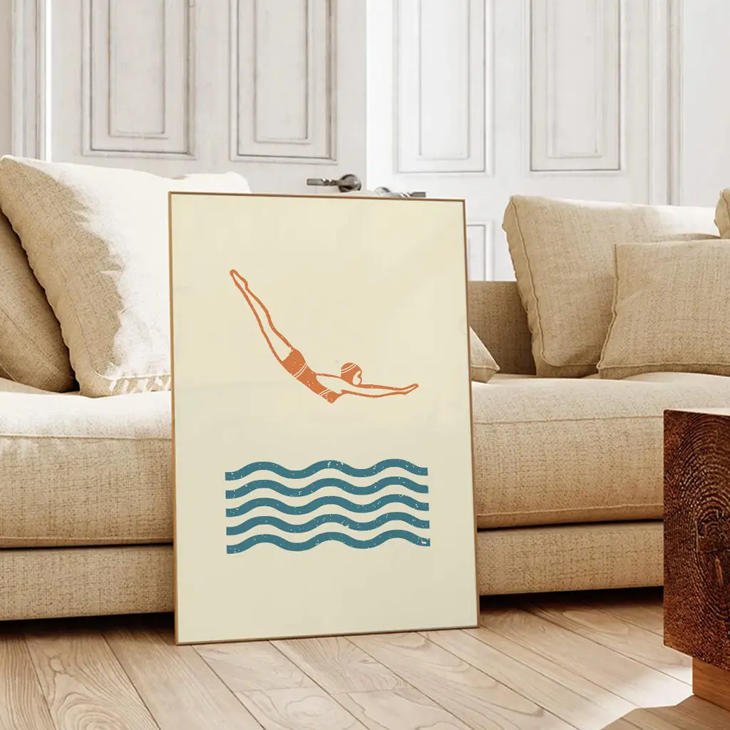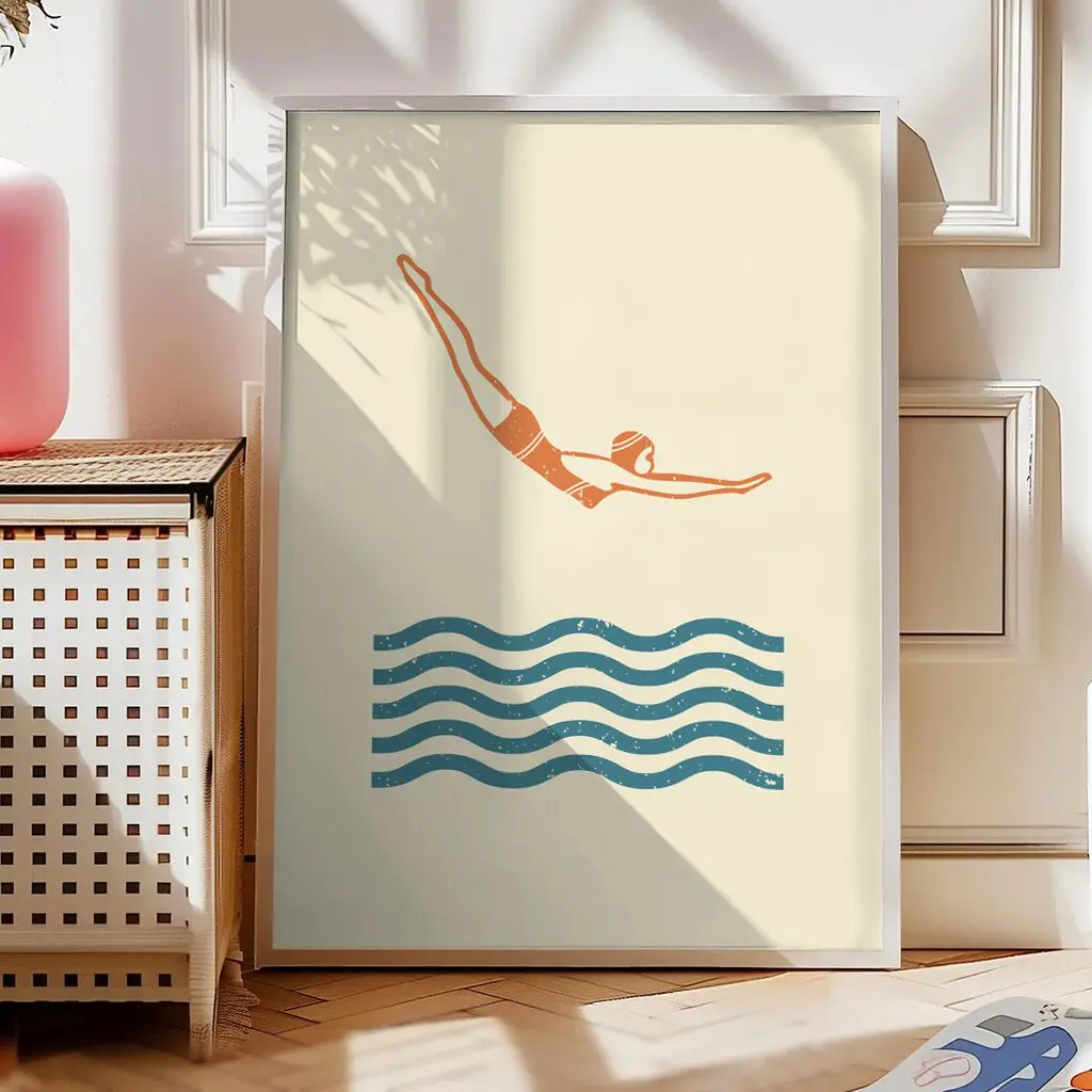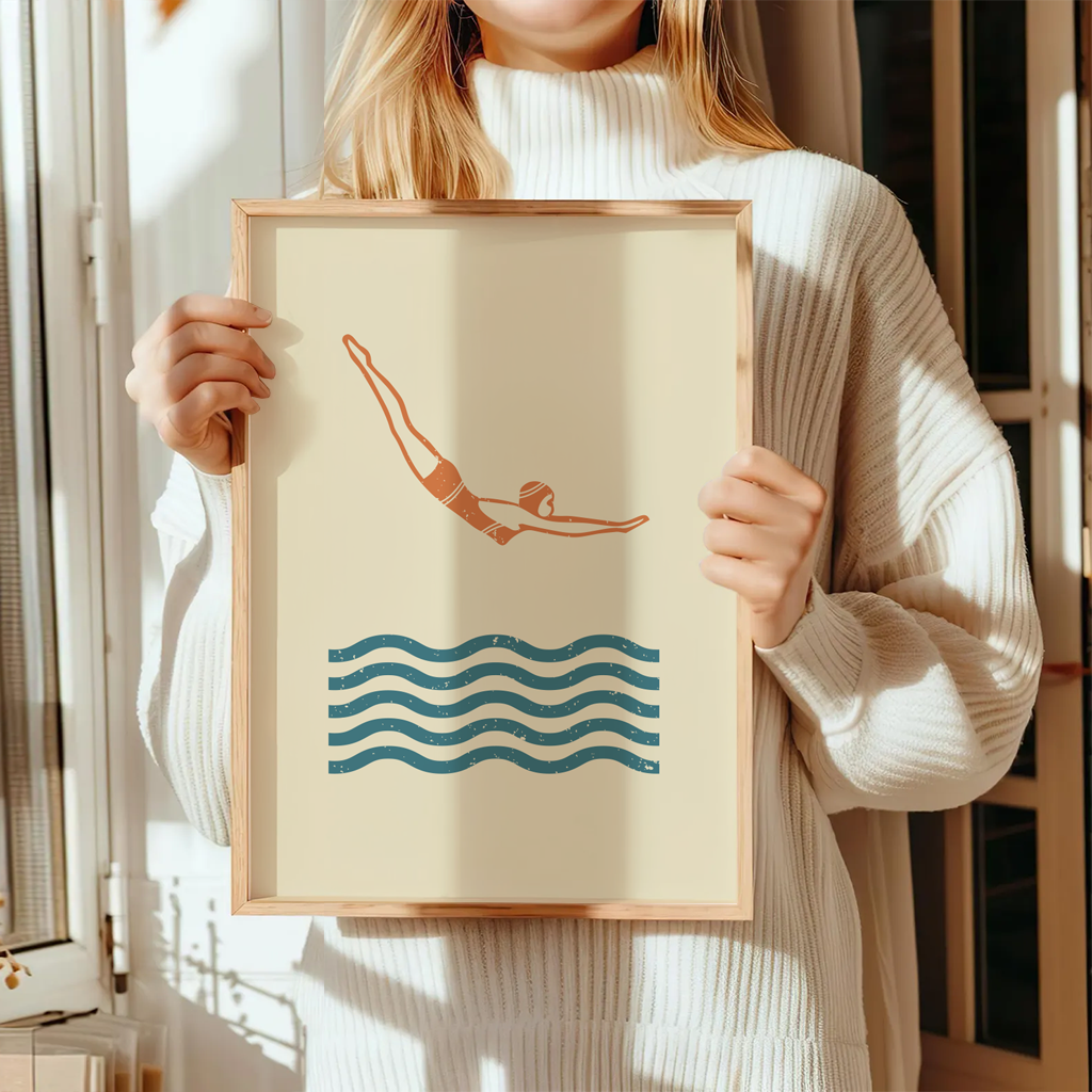 Dieses minimalistische Schwimm-Poster fängt den entscheidenden Moment des Eintauchens ein. Die klare Linienführung, die reduzierte Farbpalette und die ruhigen Wellen symbolisieren Technik, Präzision und Kontrolle. Ein stilvolles Wandbild für Schwimmer, Sportliebhaber und alle, die modernes, ruhiges Design schätzen.