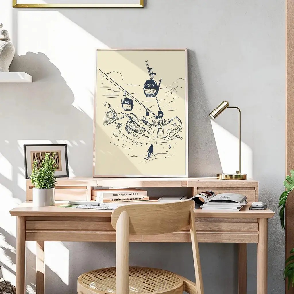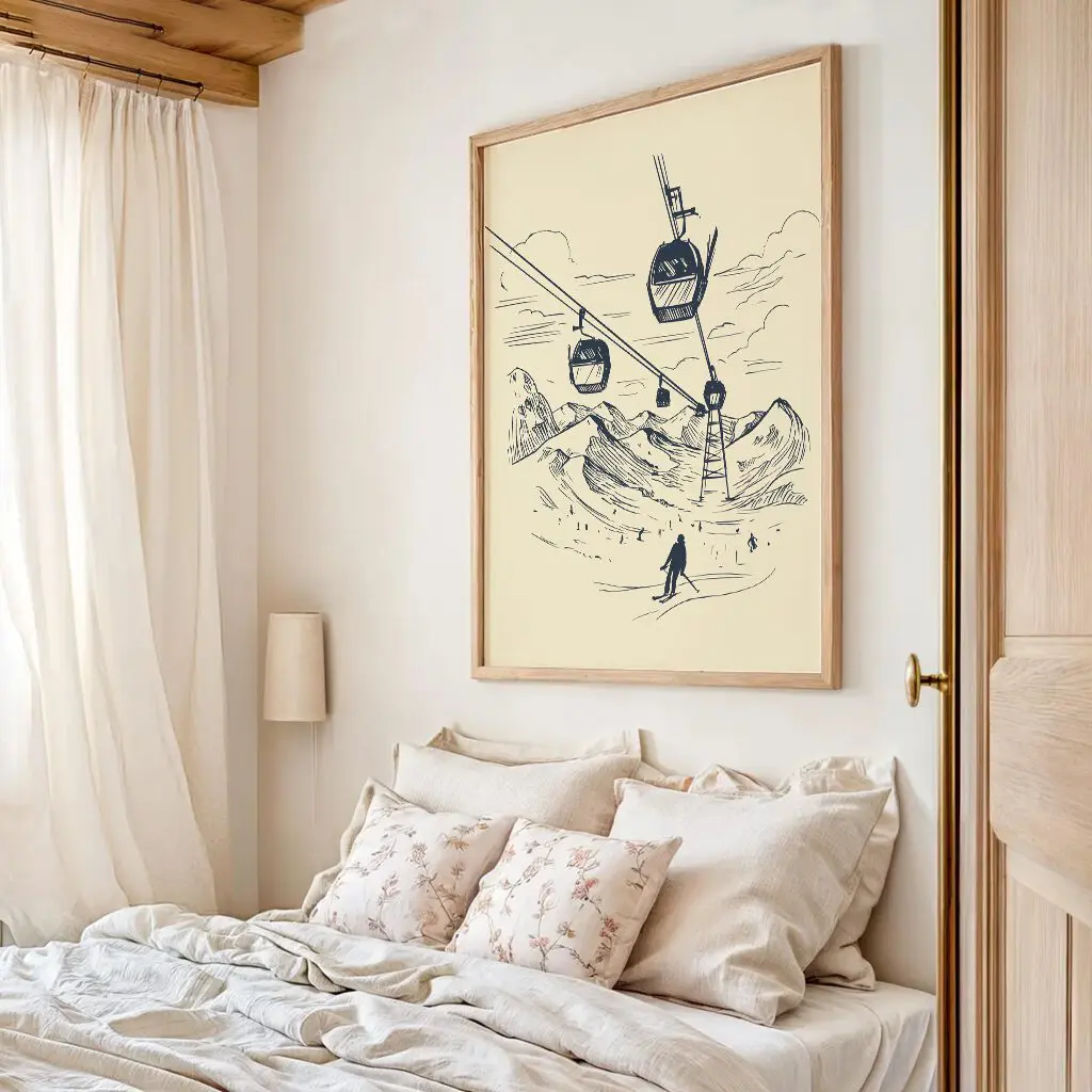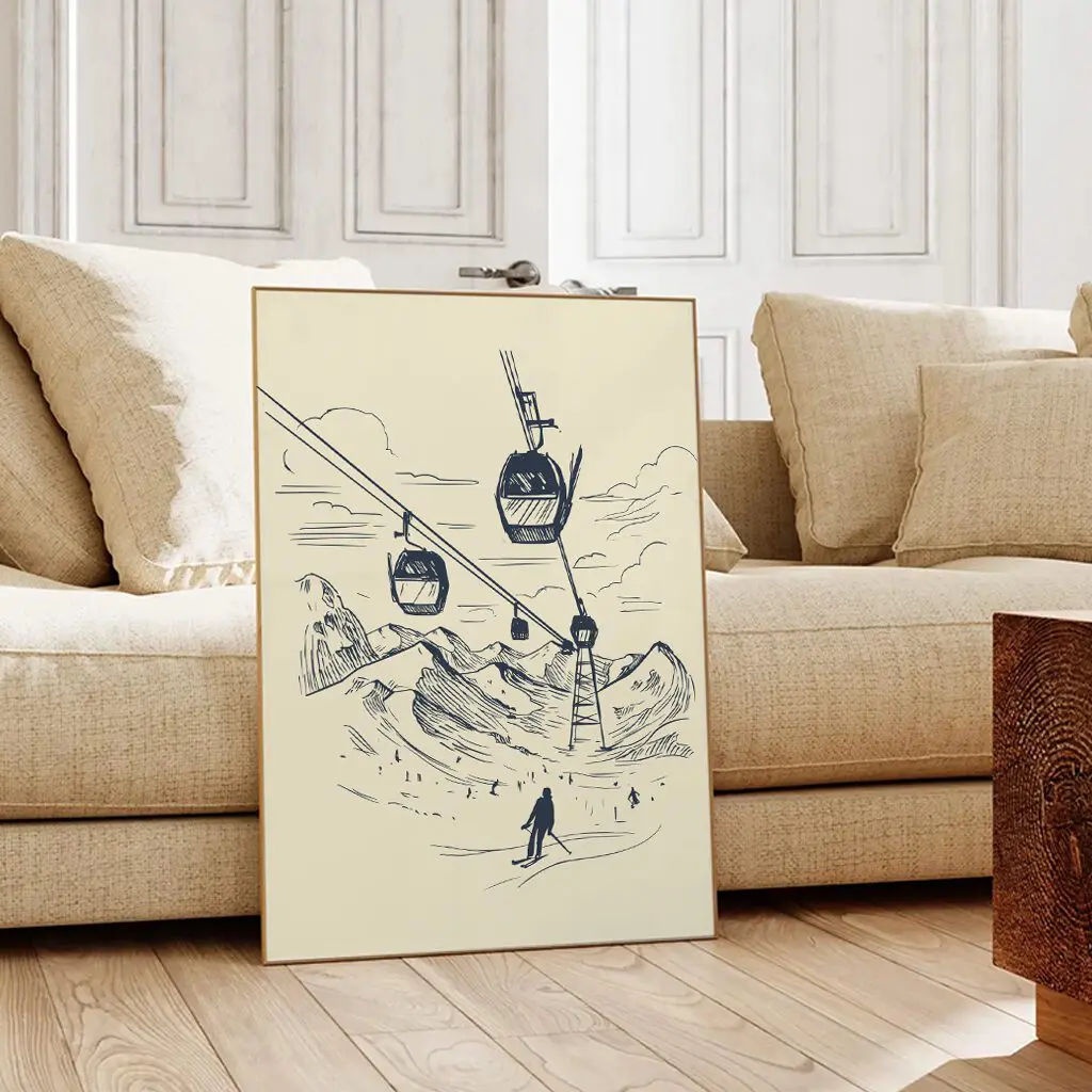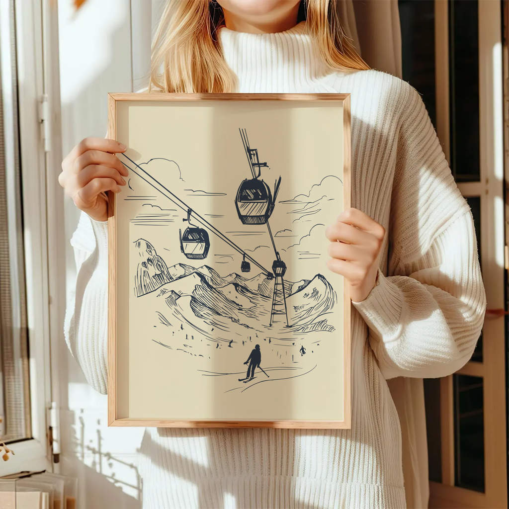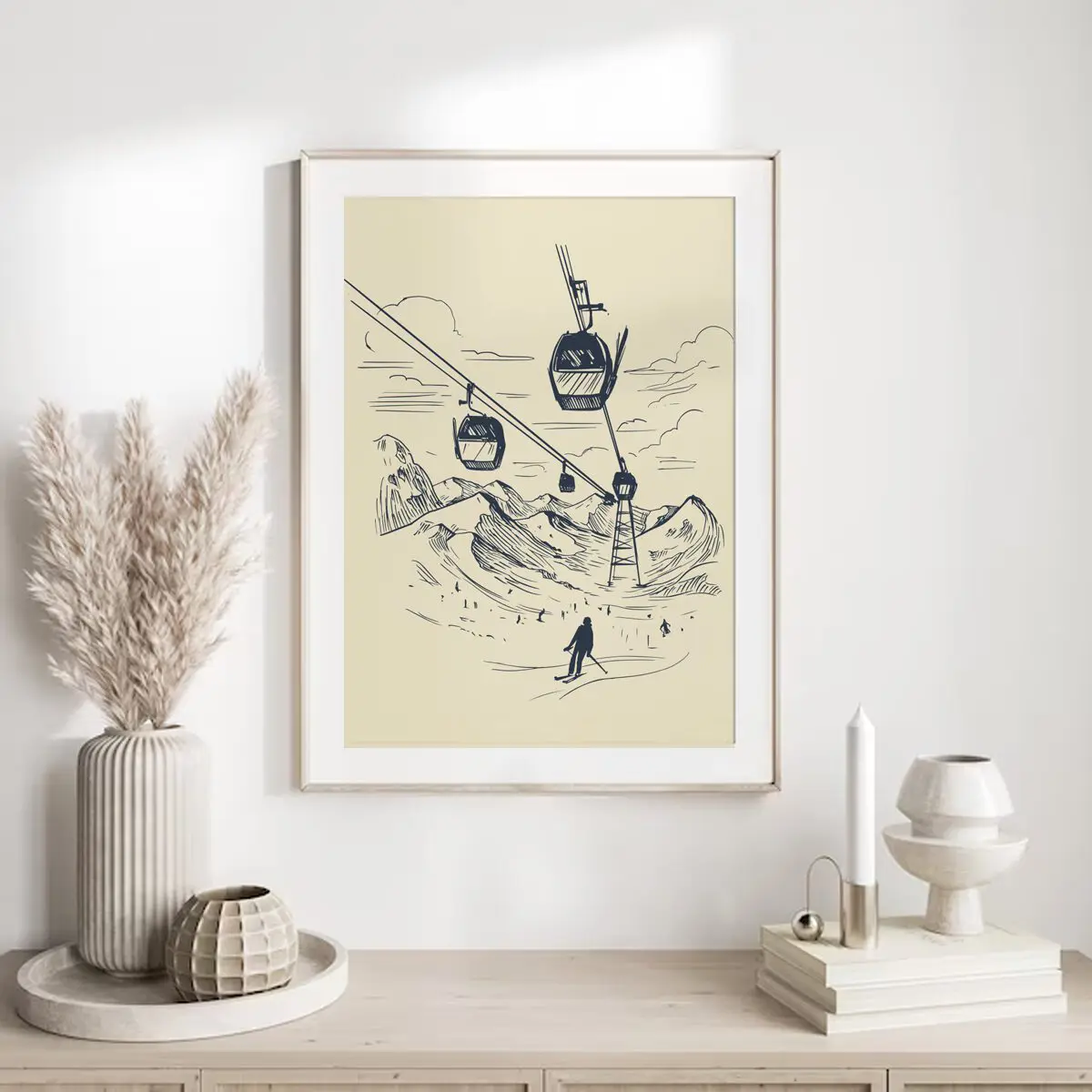 Dieses minimalistische Ski Poster zeigt eine stilisierte Berglandschaft mit Gondelbahn und Skifahrern in feiner Linienzeichnung. Die reduzierte Farbpalette und der skizzenhafte Stil verleihen dem Motiv eine ruhige, zeitlose Ästhetik, die perfekt zu modernen, skandinavischen oder minimalistischen Wohnkonzepten passt. Ideal als Wandbild für Skifahrer, Bergliebhaber oder alle, die alpine Atmosphäre dezent und elegant in ihre Räume bringen möchten.