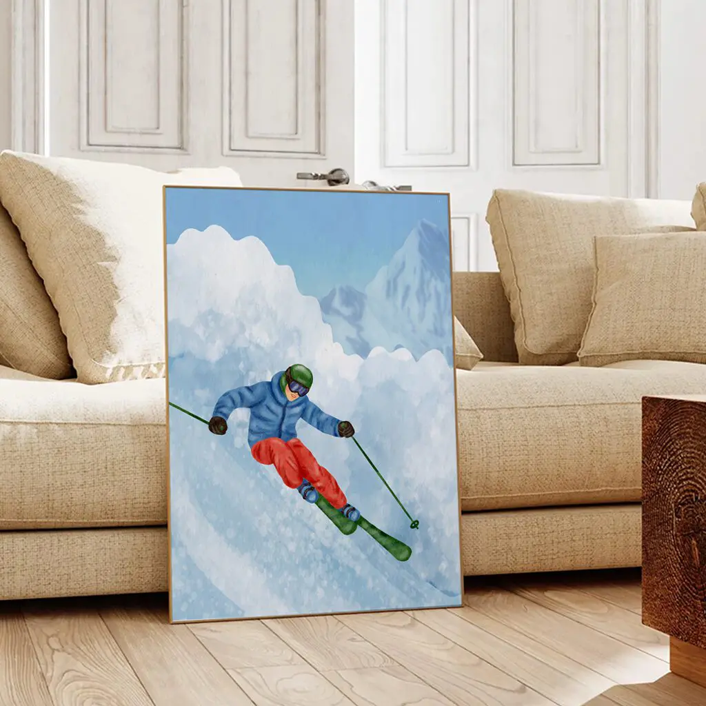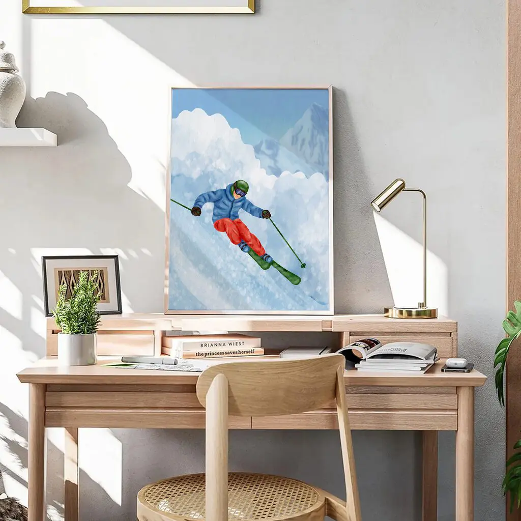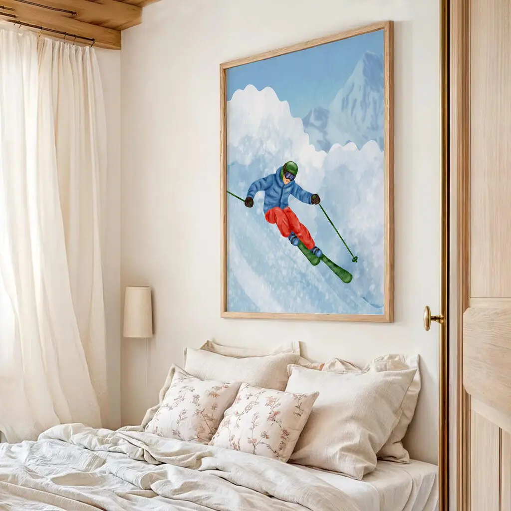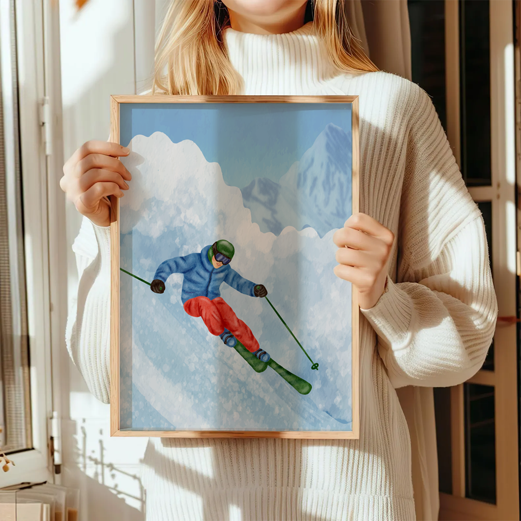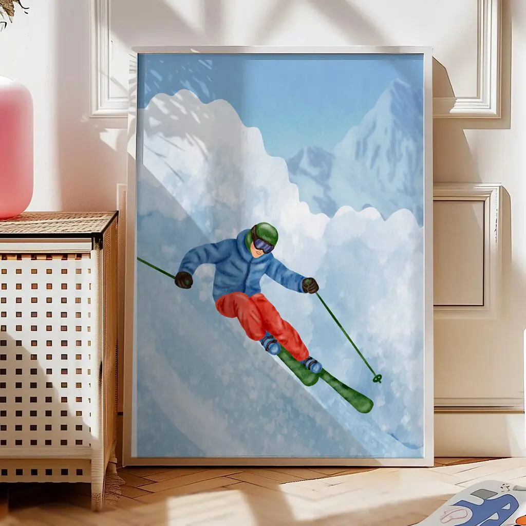 Dieses Ski Poster zeigt einen dynamischen Schwung in steiler Abfahrt, eingefangen in einer klaren, kraftvollen Illustration. Die Kombination aus Bewegung, Schnee und alpiner Kulisse vermittelt Geschwindigkeit, Kontrolle und das Gefühl von absoluter Konzentration. Das Motiv steht für sportliche Präzision und die Faszination des Skifahrens abseits der Komfortzone. Ideal für Wintersport-Fans, Skibegeisterte oder als stilvoller Akzent in modernen Wohn- und Arbeitsräumen.