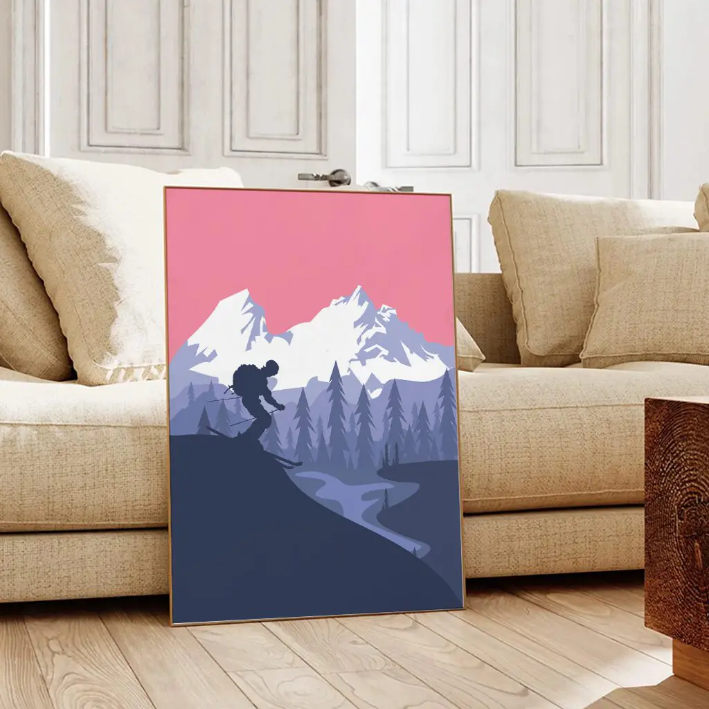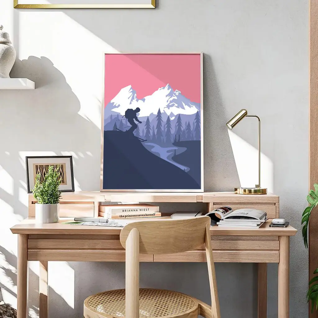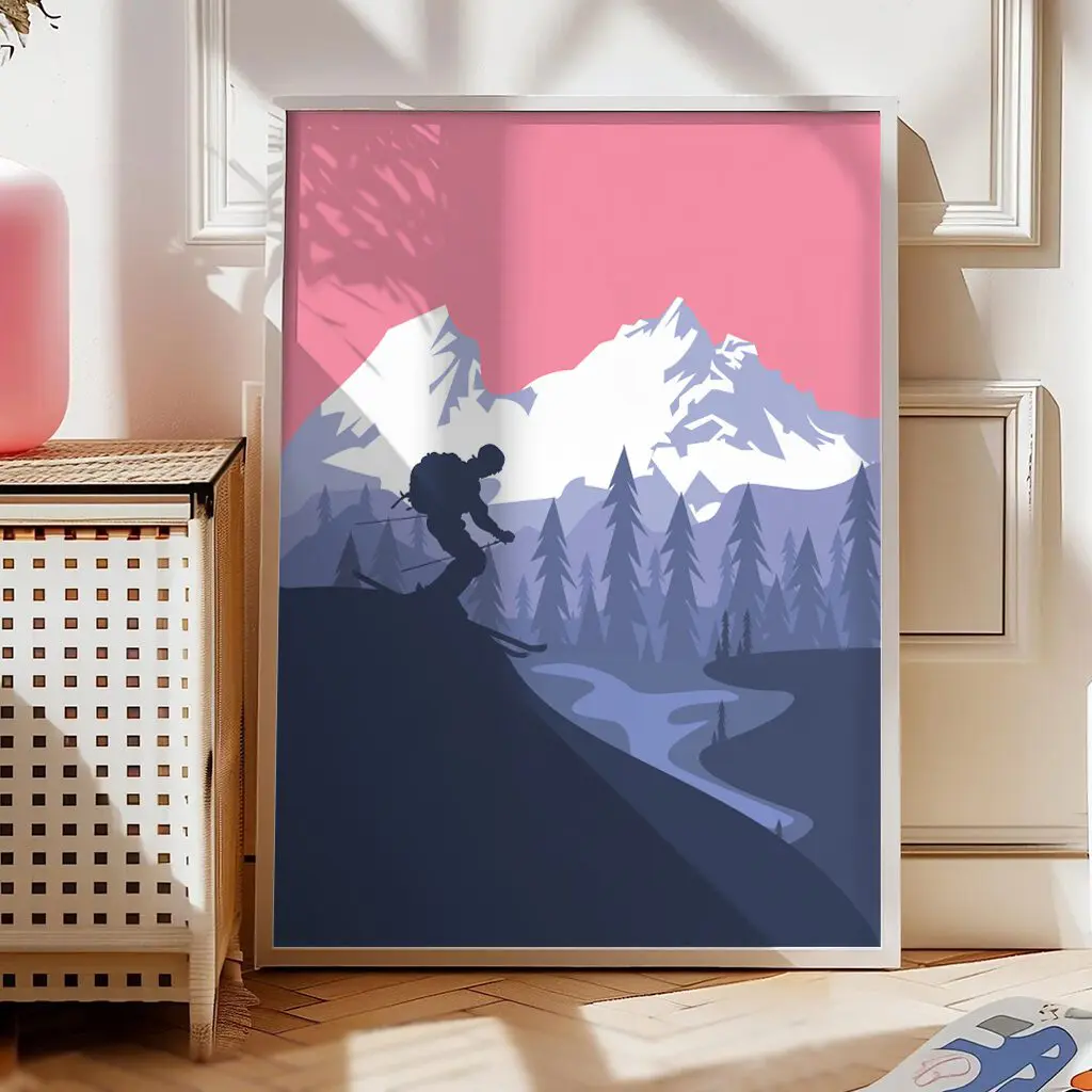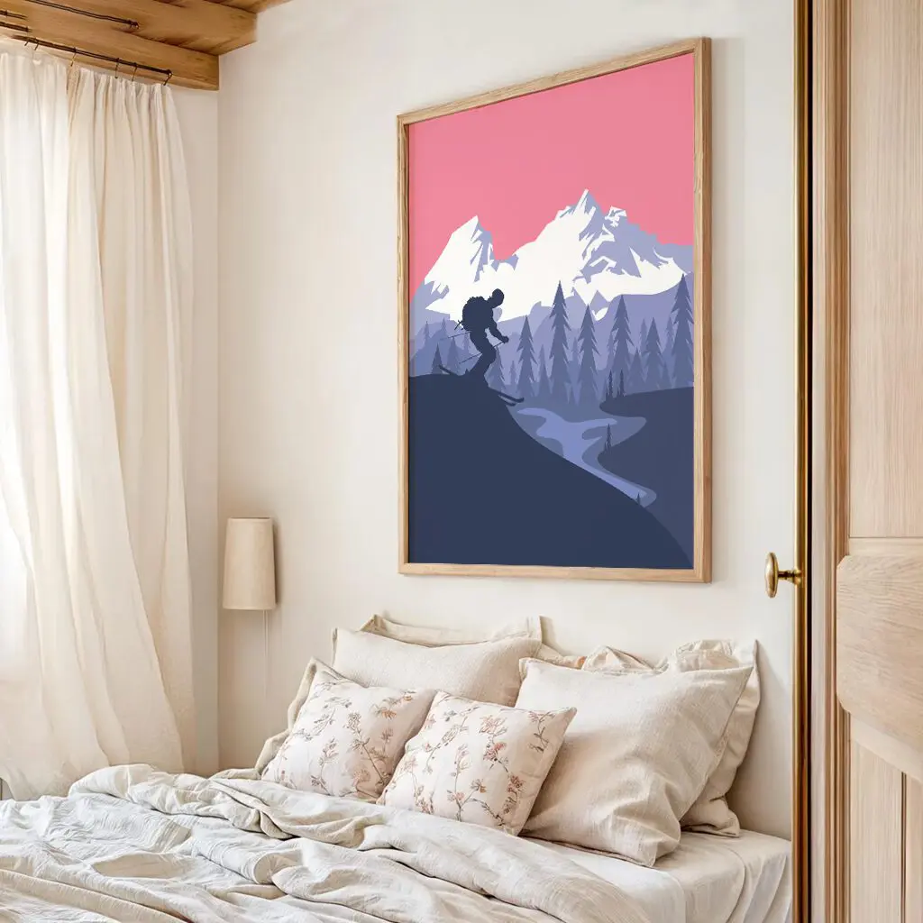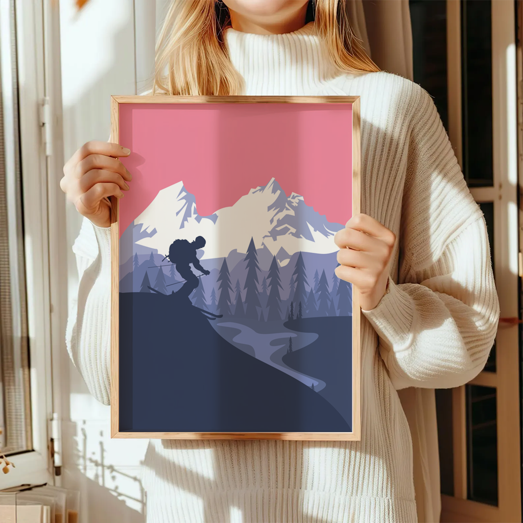 Dieses stilvolle Ski Poster zeigt einen Skifahrer als Silhouette vor einer eindrucksvollen Berglandschaft in warmen Rosé- und kühlen Blautönen. Die Kombination aus klaren Formen, ruhigem Farbverlauf und der geschwungenen Abfahrt im Tal vermittelt Freiheit, Bewegung und alpine Weite. Das moderne Design passt perfekt in minimalistische Wohnräume, Büros oder als besonderes Geschenk für Skifahrer, Bergliebhaber und Wintersportfans.