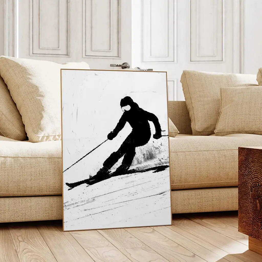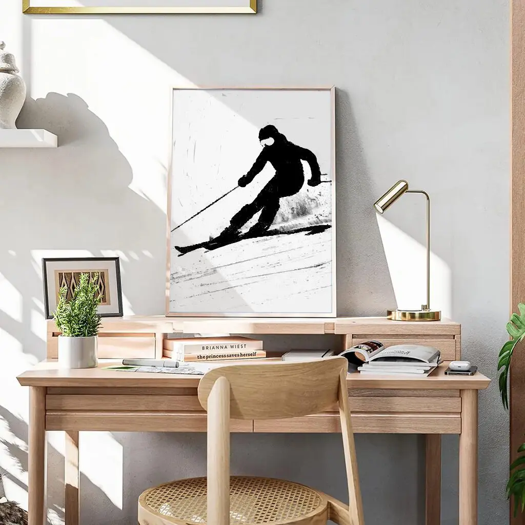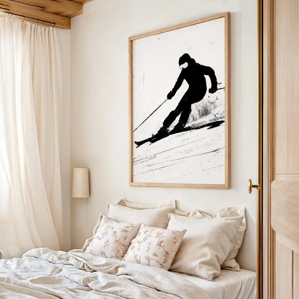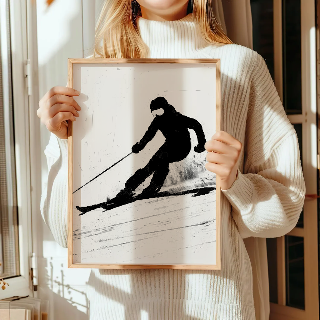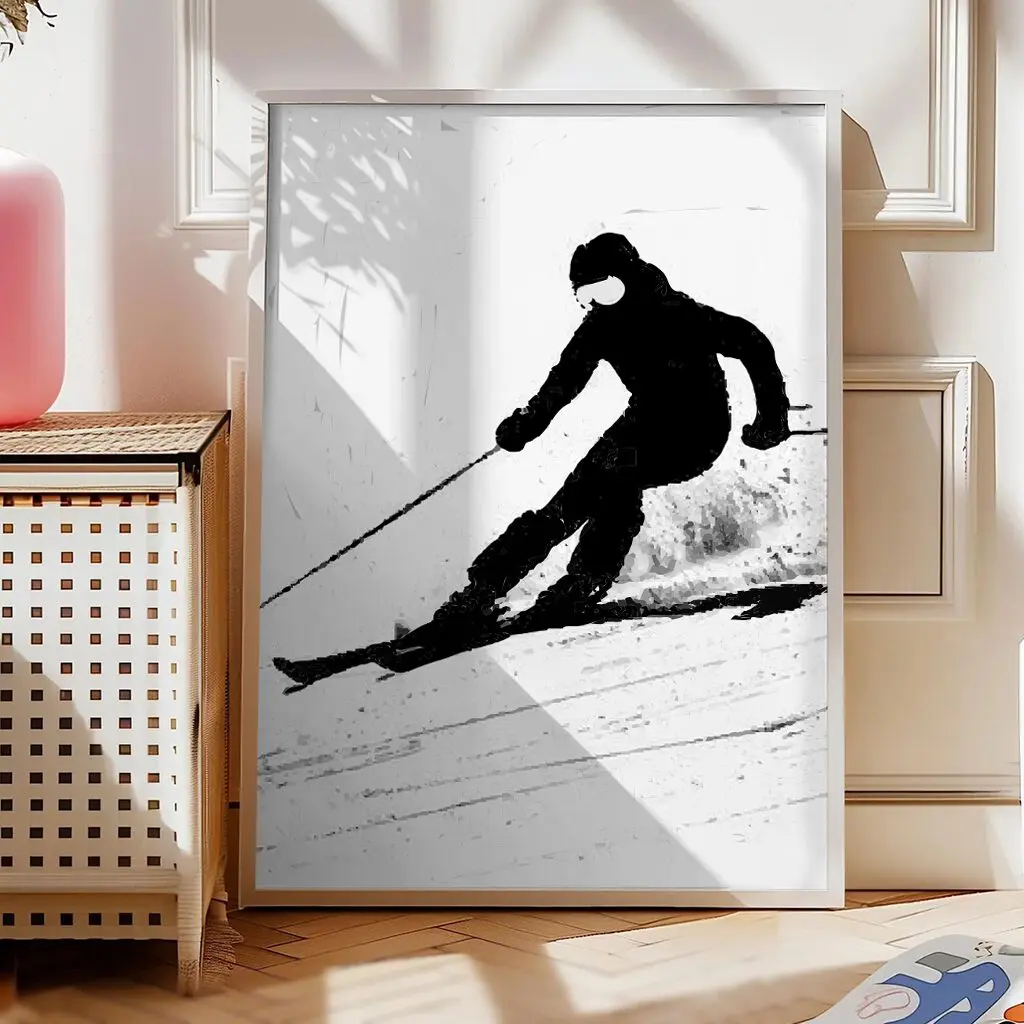 Dieses minimalistische Ski Poster fängt den perfekten Schwung auf der Piste in seiner reinsten Form ein. Die kraftvolle schwarze Silhouette vor hellem Hintergrund steht für Kontrolle, Technik und den stillen Moment zwischen Geschwindigkeit und Balance. Reduziert, elegant und zeitlos – ideal für moderne Wohnräume, Büros oder als stilvolles Geschenk für Skifahrer, die klare Linien und puristische Ski Poster schätzen.