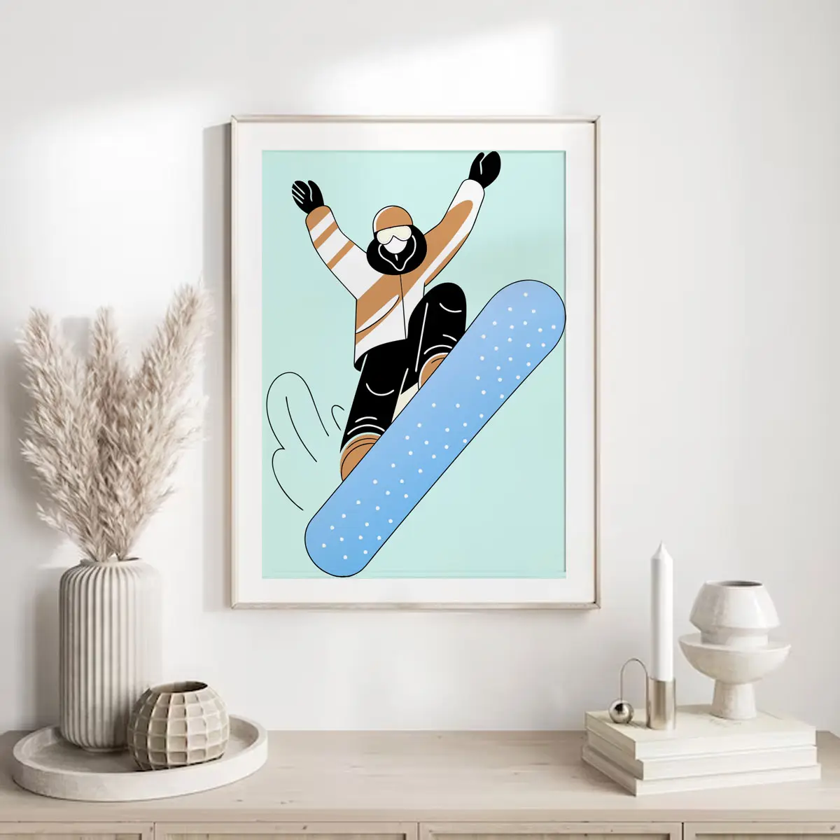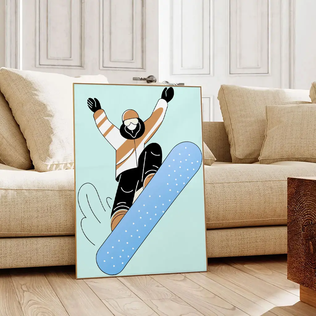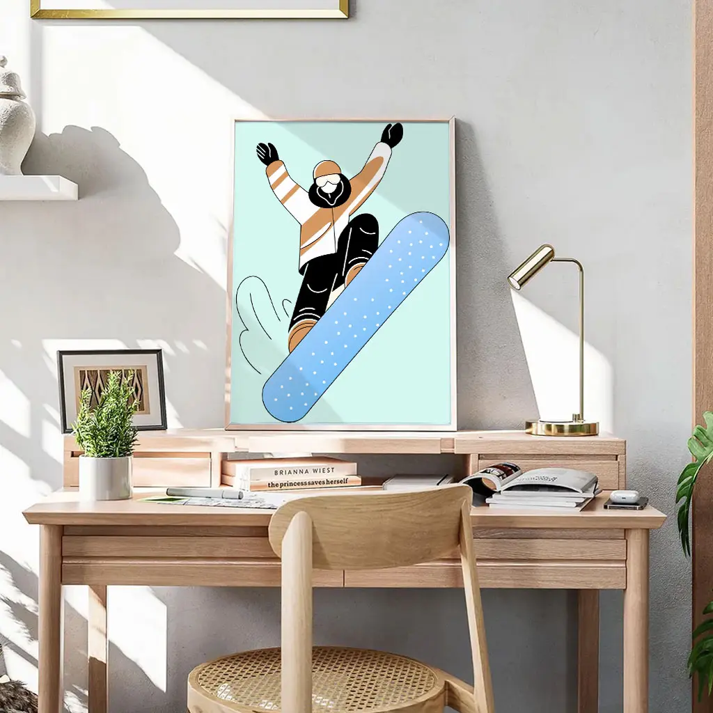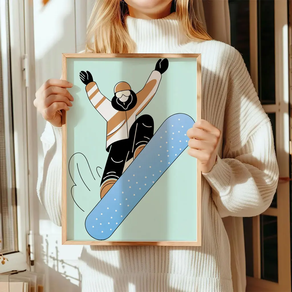 Das Poster „Air Glide“ zeigt einen Snowboarder in einer dynamischen Sprungbewegung, reduziert auf klare Formen und moderne Farben. Die Kombination aus sanften Pastelltönen und einer kraftvollen Silhouette verleiht dem Motiv eine frische, zeitgemäße Ausstrahlung.