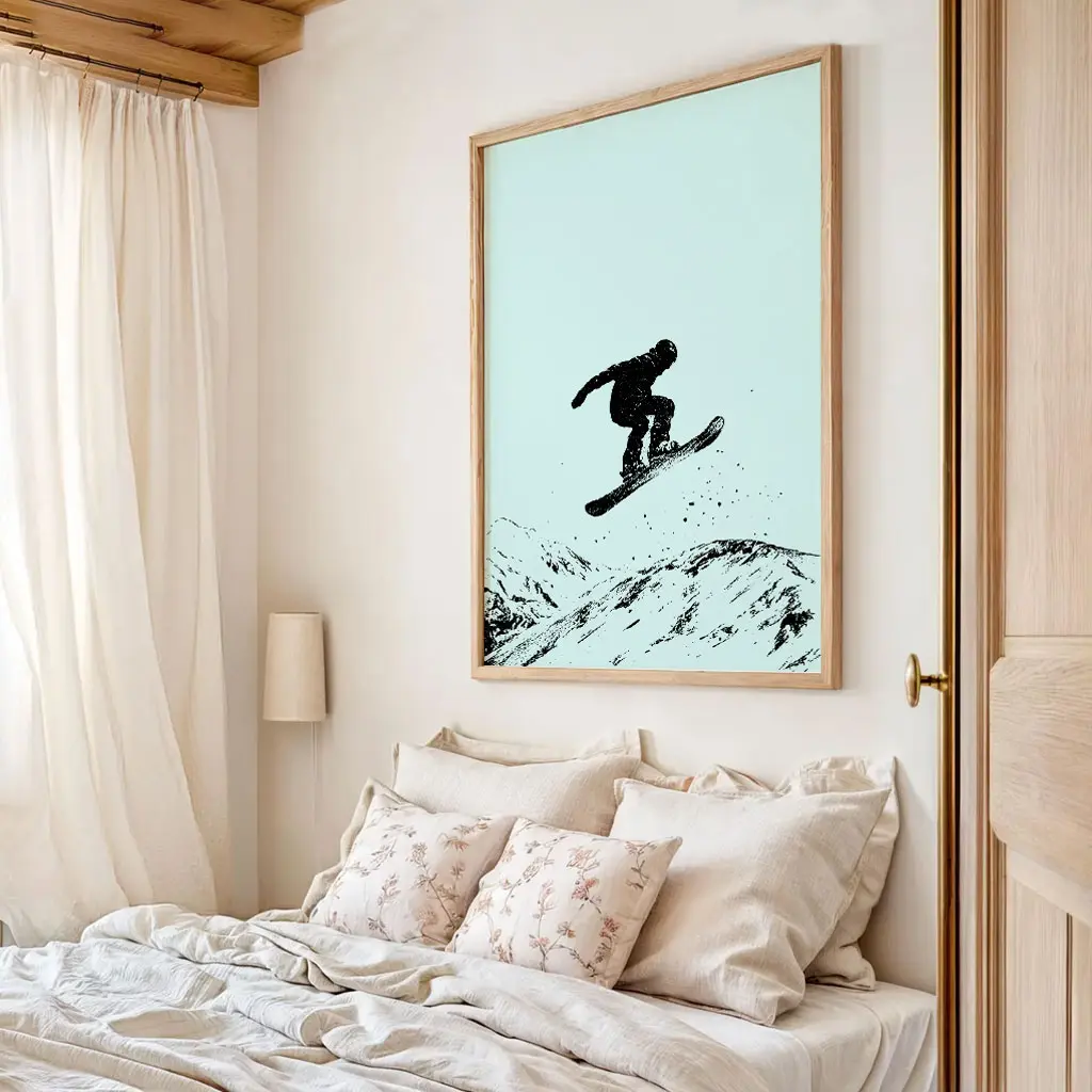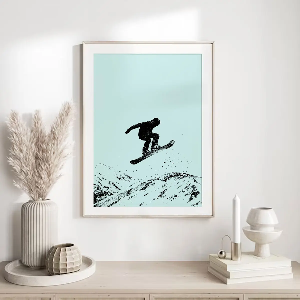 Die klare Bildsprache macht „Alpine Air“ zu einem zeitlosen Designstück, perfekt für alle, die die Freiheit des Snowboardens lieben und diese Ästhetik in ihren Raum bringen möchten.