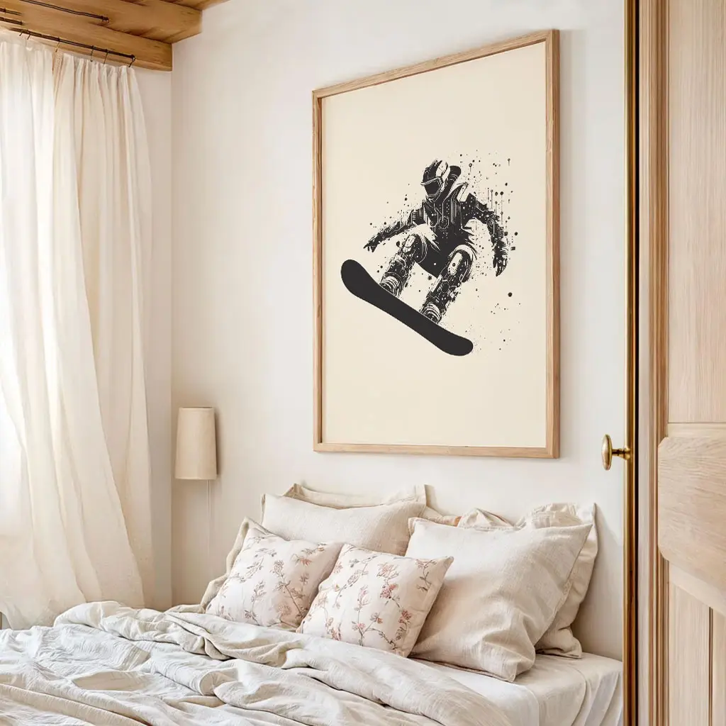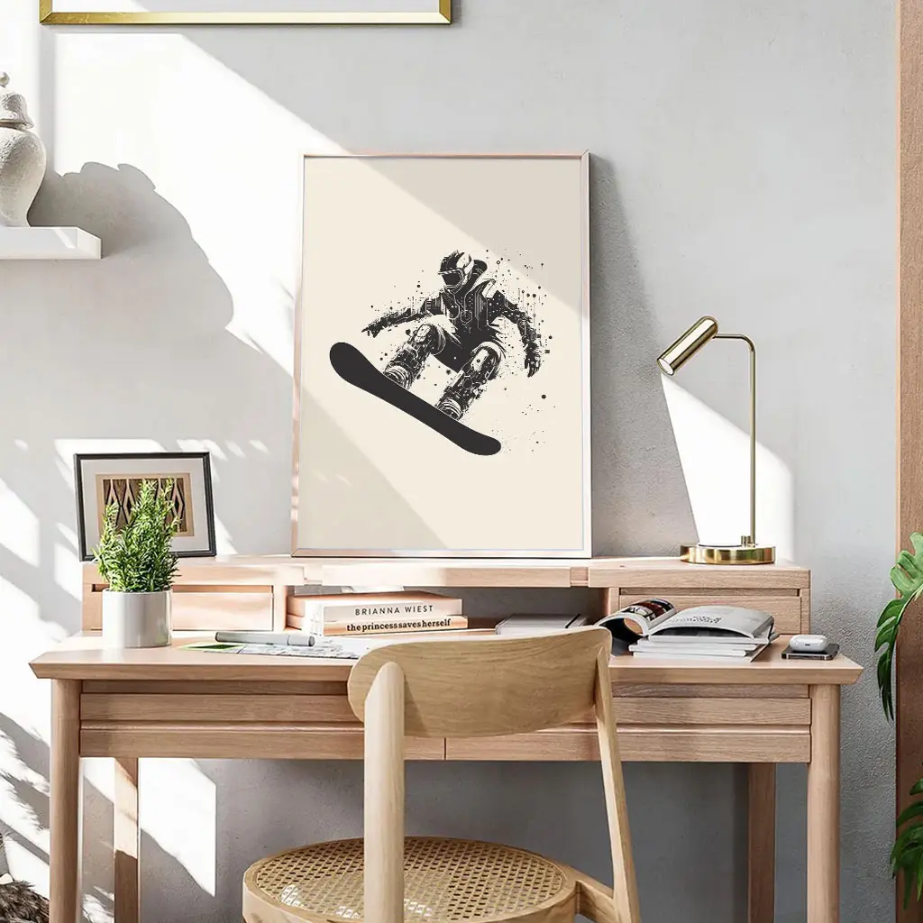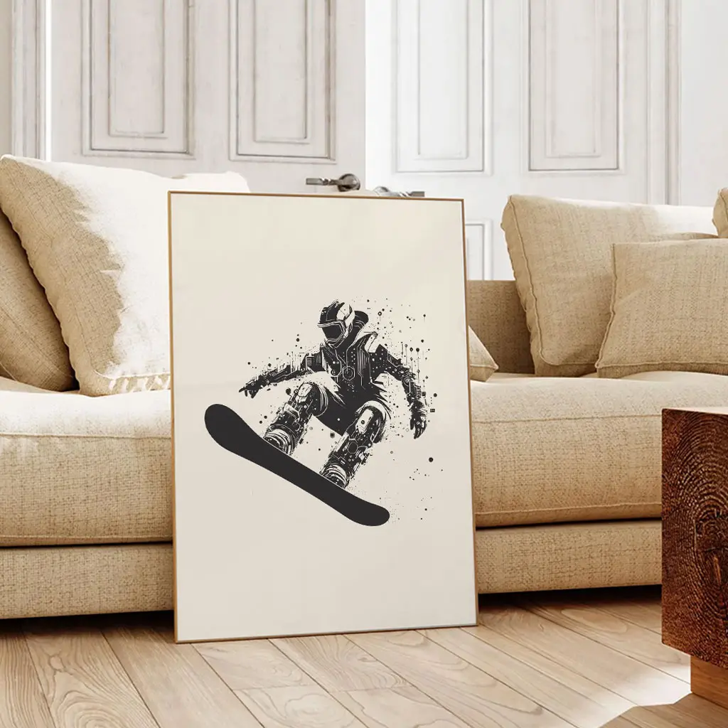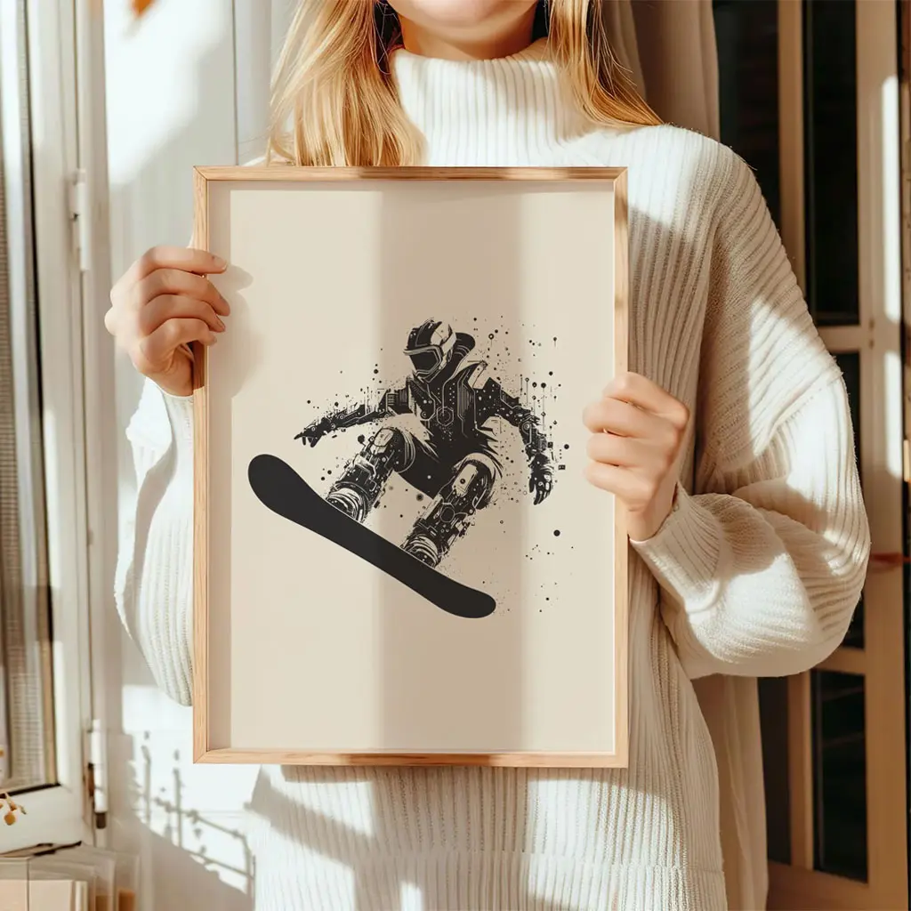 Das Poster „Urban Rider“ verbindet Snowboard-Action mit einem grafischen, fast skizzenhaften Stil. Die schwarz-weiße Illustration mit dynamischen Spritzern verleiht dem Motiv eine urbane, kreative Note und hebt die Bewegung des Riders besonders hervor.