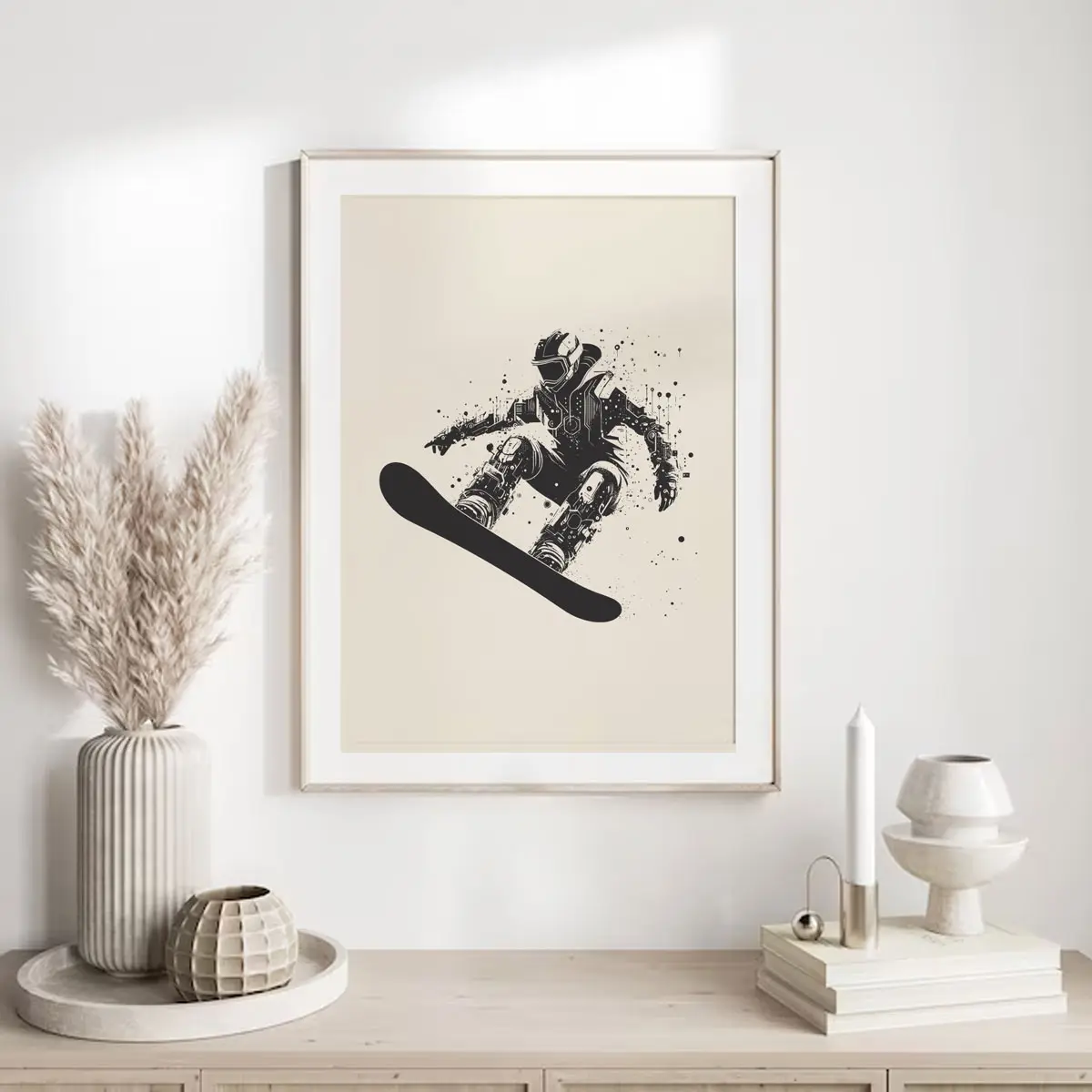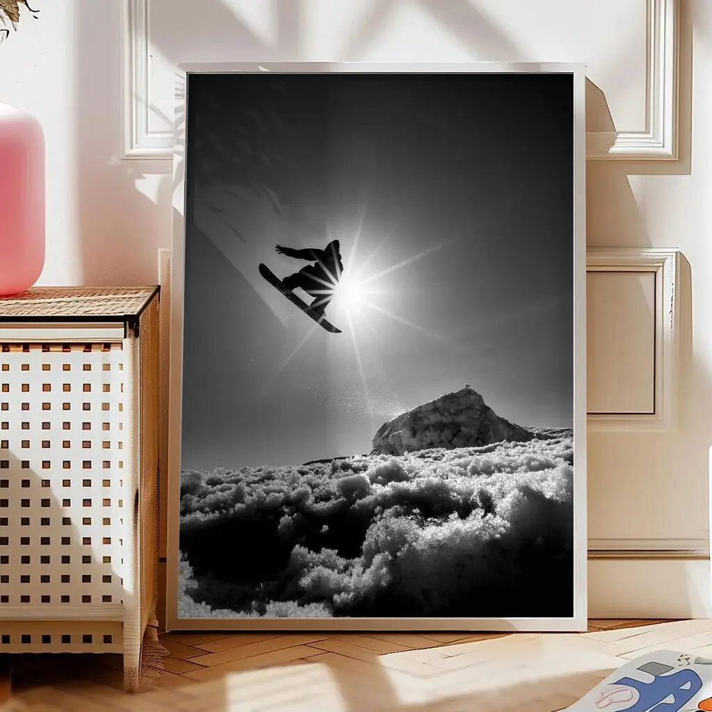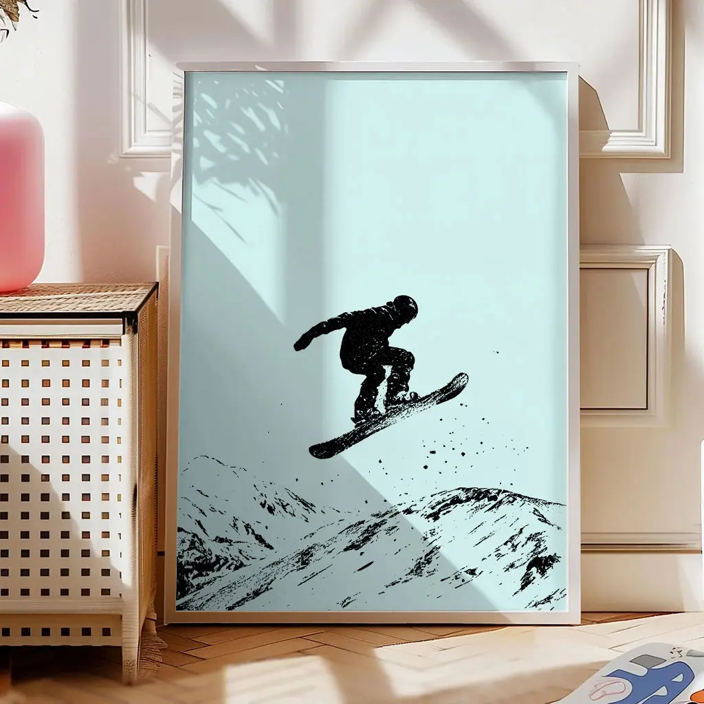 Das Poster „Urban Rider“ verbindet Snowboard-Action mit einem grafischen, fast skizzenhaften Stil. Die schwarz-weiße Illustration mit dynamischen Spritzern verleiht dem Motiv eine urbane, kreative Note und hebt die Bewegung des Riders besonders hervor.