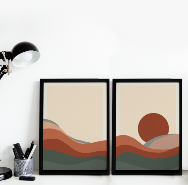 Dieses minimalistische Wandbild-Set im zweiteiligen Design fängt die majestätische Schönheit der Berge in einer stilvollen Illustration ein. Sanfte Farbtöne und eine klare Linienführung verleihen den Motiven eine beruhigende und moderne Ausstrahlung, während die Sonne im Hintergrund eine warme Atmosphäre schafft. Perfekt für alle, die ihre Liebe zur Natur und zum Wandern auch in ihren Wohnräumen ausdrücken möchten, fügt sich dieses Wandbild harmonisch in verschiedenste Einrichtungsstile ein und sorgt für eine stilvolle Wandgestaltung.