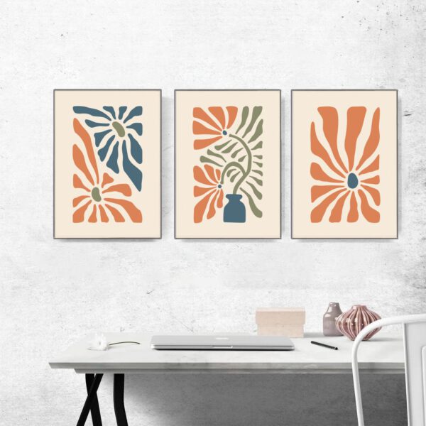 Dieses dreiteilige Poster-Set bringt mit seinen floralen Formen und warmen Erdtönen eine ruhige, organische Atmosphäre in dein Zuhause. Inspiriert vom Boho-Stil, treffen hier weiche Linien auf kräftige Farben – in Terrakotta, Olivgrün und Tiefblau. Die abstrakten Blüten wirken wie tanzende Naturgeister und laden dich dazu ein, den Blick schweifen zu lassen und innerlich zur Ruhe zu kommen.