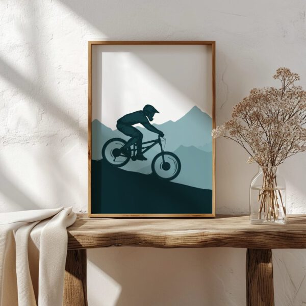 Erlebe den Nervenkitzel des Abenteuers mit diesem beeindruckenden Wandbild eines Mountainbikes beim Downhill-Abstieg. Die Szene fängt den Moment voller Dynamik, Geschwindigkeit und Naturverbundenheit perfekt ein – ideal für alle, die den Adrenalinkick lieben oder die Faszination des Mountainbikens in ihrem Zuhause sichtbar machen möchten.