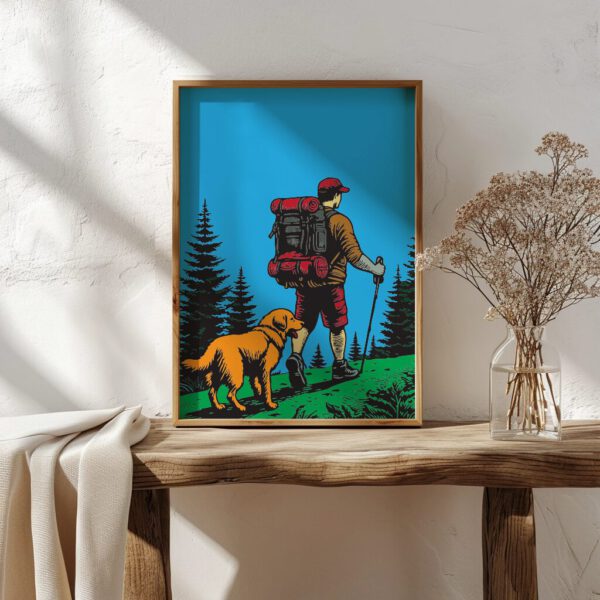 Diese kunstvolle Illustration zeigt einen Wanderer mit seinem Hund auf einem inspirierenden Pfad durch die Wildnis. Die lebendigen Farben und detailreiche Gestaltung bringen die Abenteuerlust direkt an deine Wand.