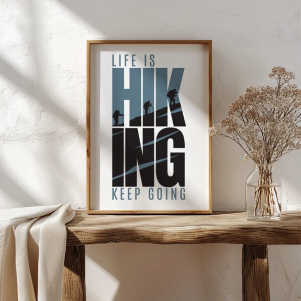 Für alle, die nie aufgeben: Keep Going ist mehr als nur ein Wandbild – es ist eine Botschaft. Mit dem markanten Schriftzug „Life is Hiking – Keep Going“ und den stilisierten Wanderfiguren transportiert dieses Poster Energie, Entschlossenheit und Abenteuerlust.