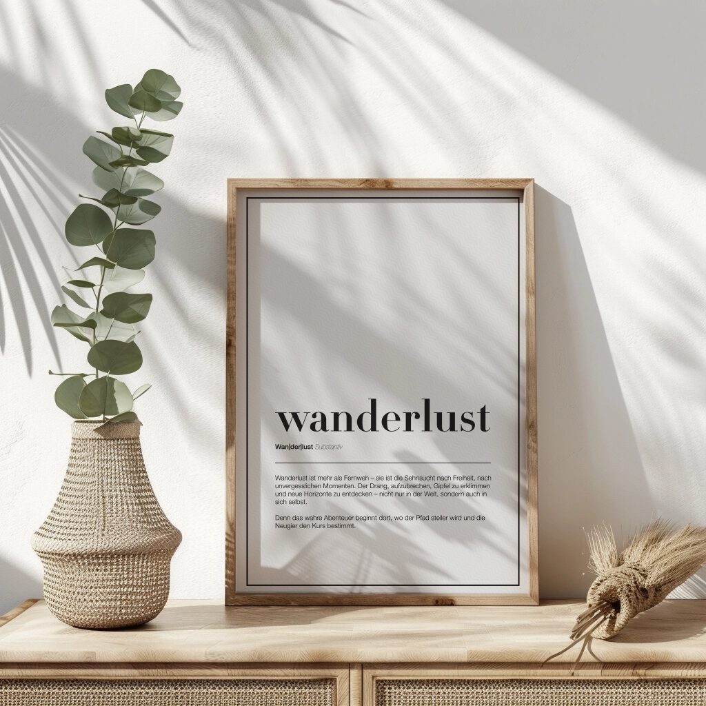 Dieses minimalistische Poster erklärt das Wort “Wanderlust” auf eine kunstvolle Weise. Es ist mehr als nur eine Definition – es spiegelt die tiefe Sehnsucht nach Freiheit und Entdeckung wider. Der Text beschreibt den Drang, neue Horizonte zu erkunden, Gipfel zu erklimmen und das wahre Abenteuer zu erleben, das nicht nur in der Welt, sondern auch in einem selbst beginnt. Ideal für alle, die die Leidenschaft fürs Reisen und das Streben nach neuen Erlebnissen lieben. Mit klarer, eleganter Typografie und hochwertigem Druck bringt dieses Poster sowohl Stil als auch Inspiration in jedes Zuhause. Ein perfektes Geschenk für Abenteuerlustige und Naturfreunde.